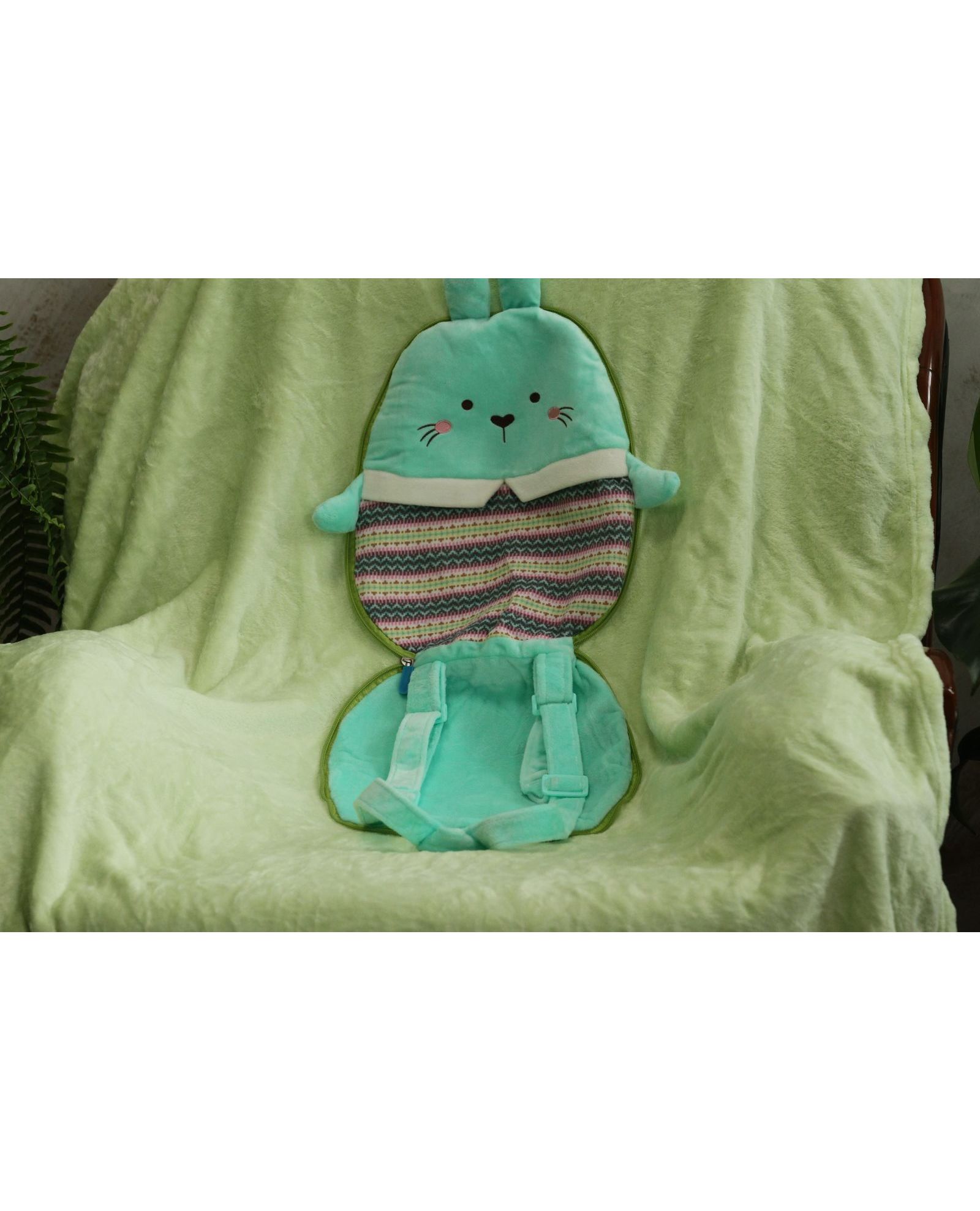 Цей милий рюкзак-трансформер стане улюбленим аксесуаром для прогулянок, подорожей або домашнього затишку. У складеному вигляді – це рюкзак розміром 25×30 см у вигляді кролика м’ятного кольору, а в розгорнутому – м’яке покривало салатового кольору розміром 110×160 см.