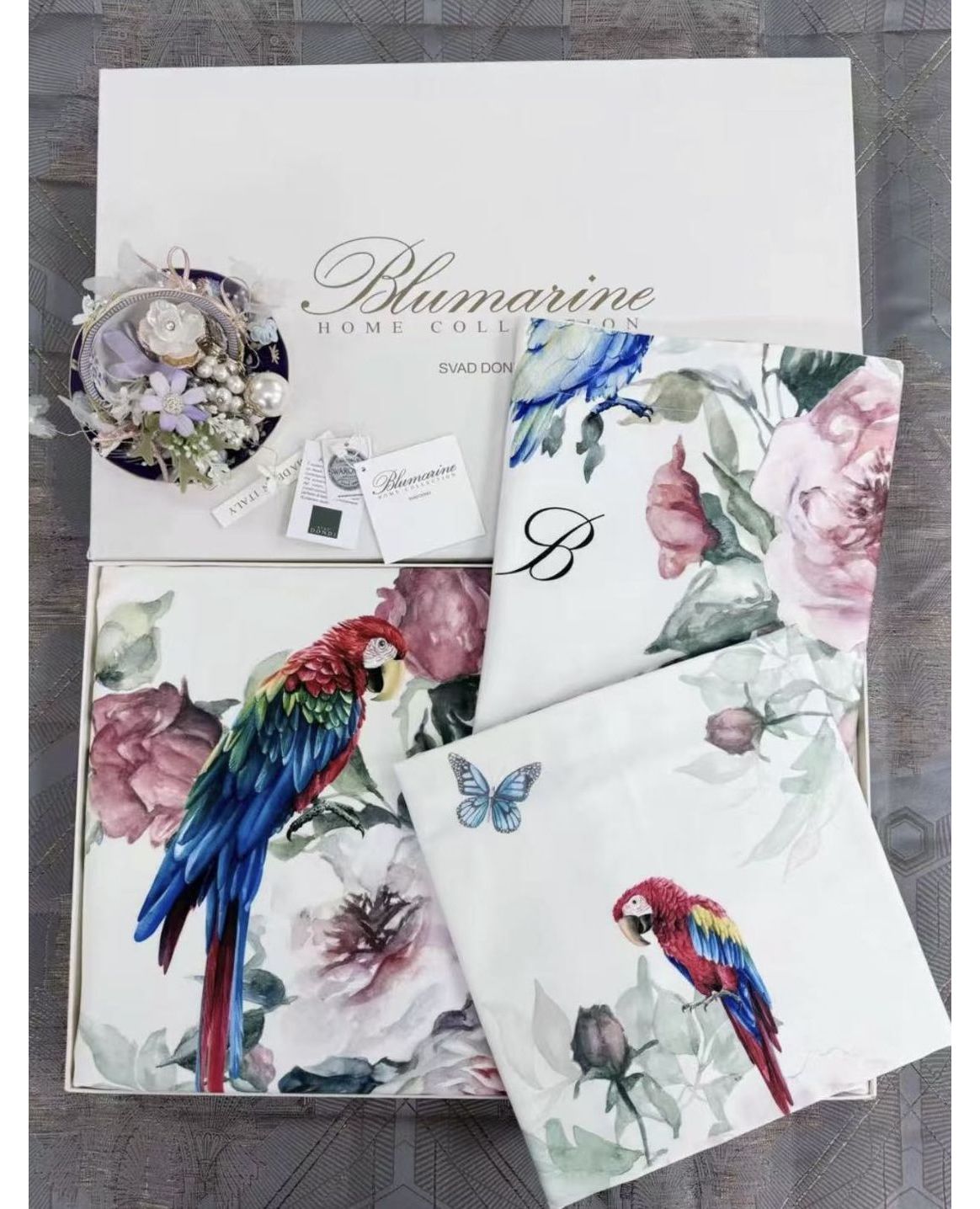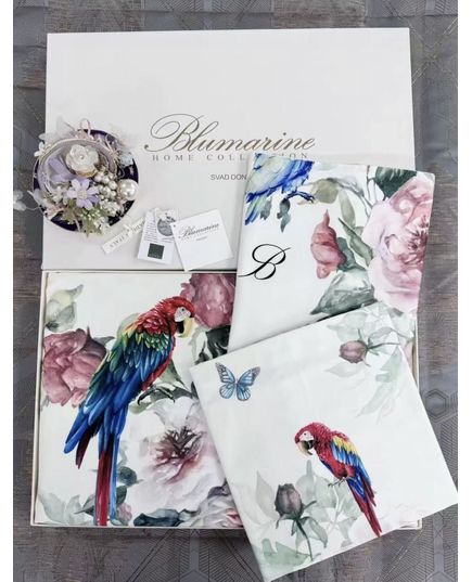 Постільна білизна з сатину Delux білого кольору з квітами та папугами
