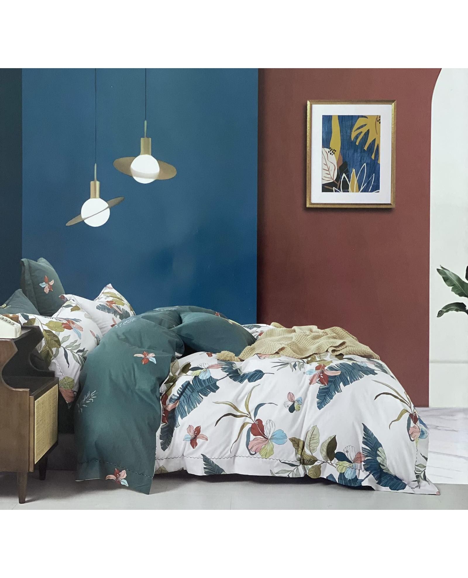 Яскравий смарагдовий колір у поєднанні з білим і витонченим квітковим принтом створює свіжу й елегантну атмосферу в спальні. Натуральний сатин дарує м’якість і розкішний блиск.