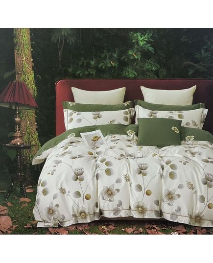 Свіже поєднання зеленого та білого з квітковими мотивами створює атмосферу легкості та природної гармонії у спальні. Сатинова тканина м’яка, приємна до тіла й ідеальна для щоденного користування.
