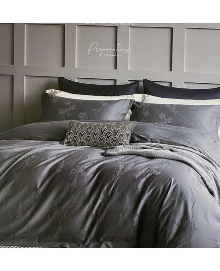Темно-сірий колір із витонченим жаккардовим візерунком створює спокійну й елегантну атмосферу у вашій спальні. Натуральна бавовна забезпечує комфортний мікроклімат, м’якість і приємні тактильні відчуття протягом ночі.