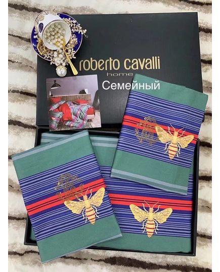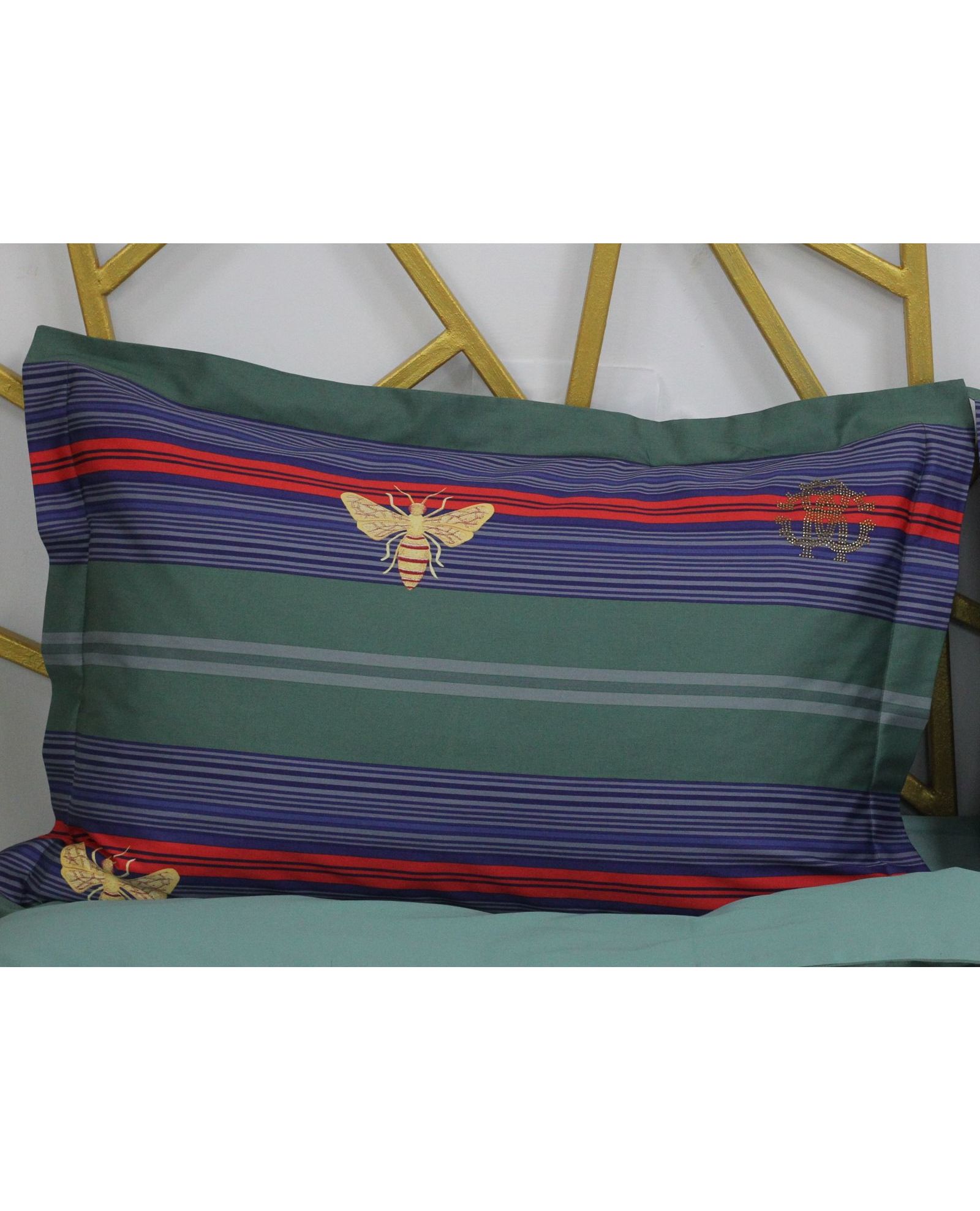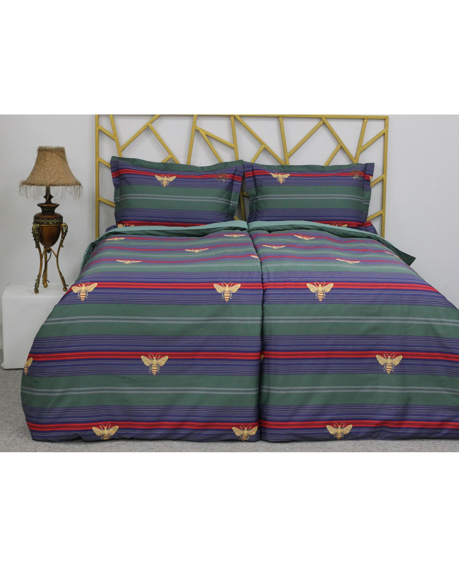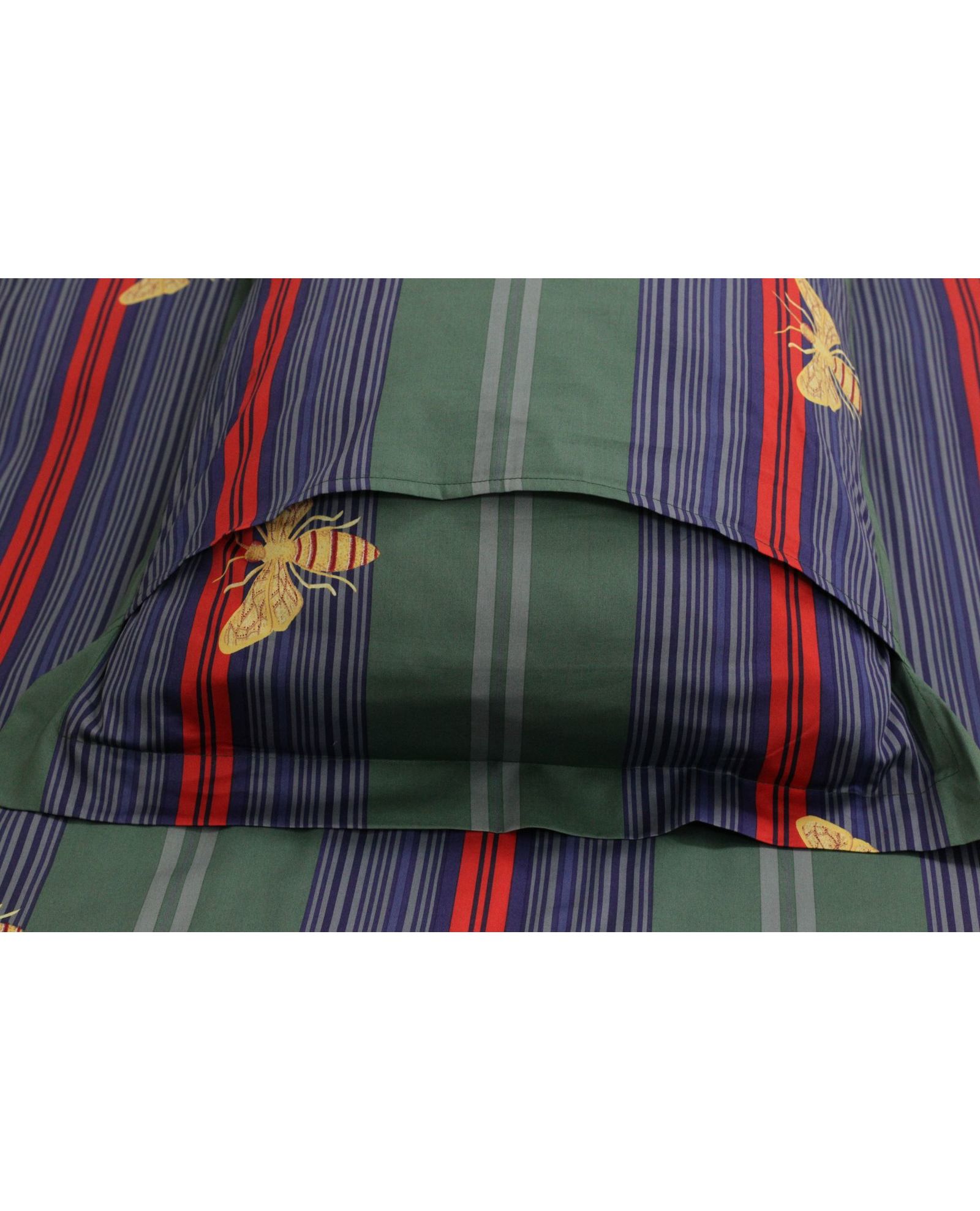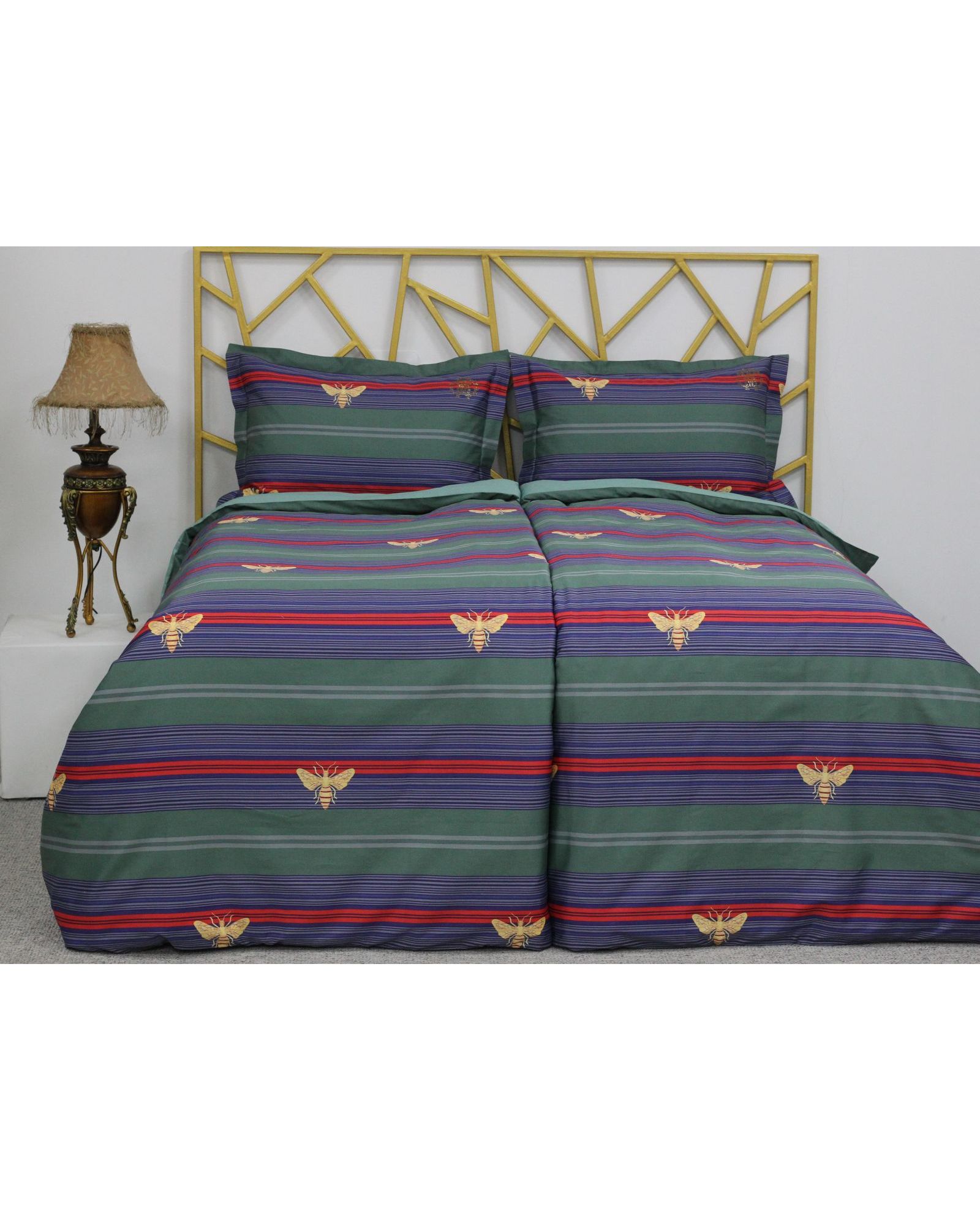 Сімейний комплект постільної білизни з єгипетської бавовни, зелений із синіми смужками