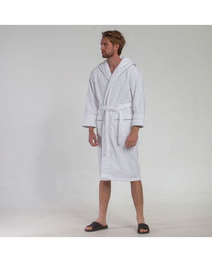 Елегантний чоловічий халат у класичному білому кольорі ідеально підходить для комфортного відпочинку після душу, ванни або сауни. Махрова тканина з бавовни та бамбука м’яка, приємна до тіла, добре вбирає вологу та дарує відчуття свіжості й тепла. Капюшон забезпечує додатковий затишок і практичність у щоденному використанні.