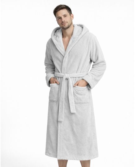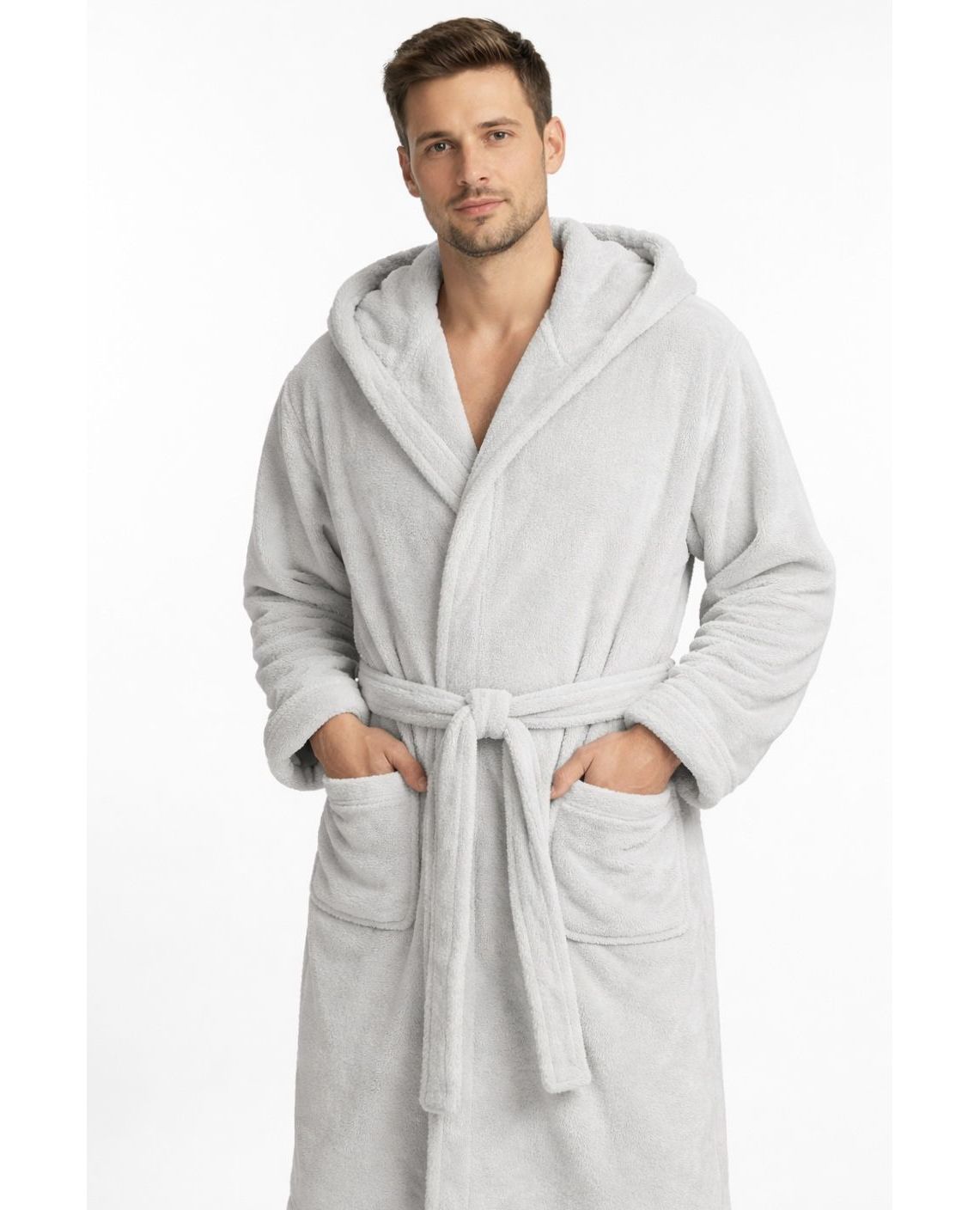 Чоловічий махровий халат із капюшоном створений для комфортного відпочинку після душу, ванни або сауни. Тканина з поєднанням бавовни та бамбука м’яка, ніжна до шкіри та добре вбирає вологу. Світло-сірий колір виглядає стримано та сучасно, підходить для щоденного використання.