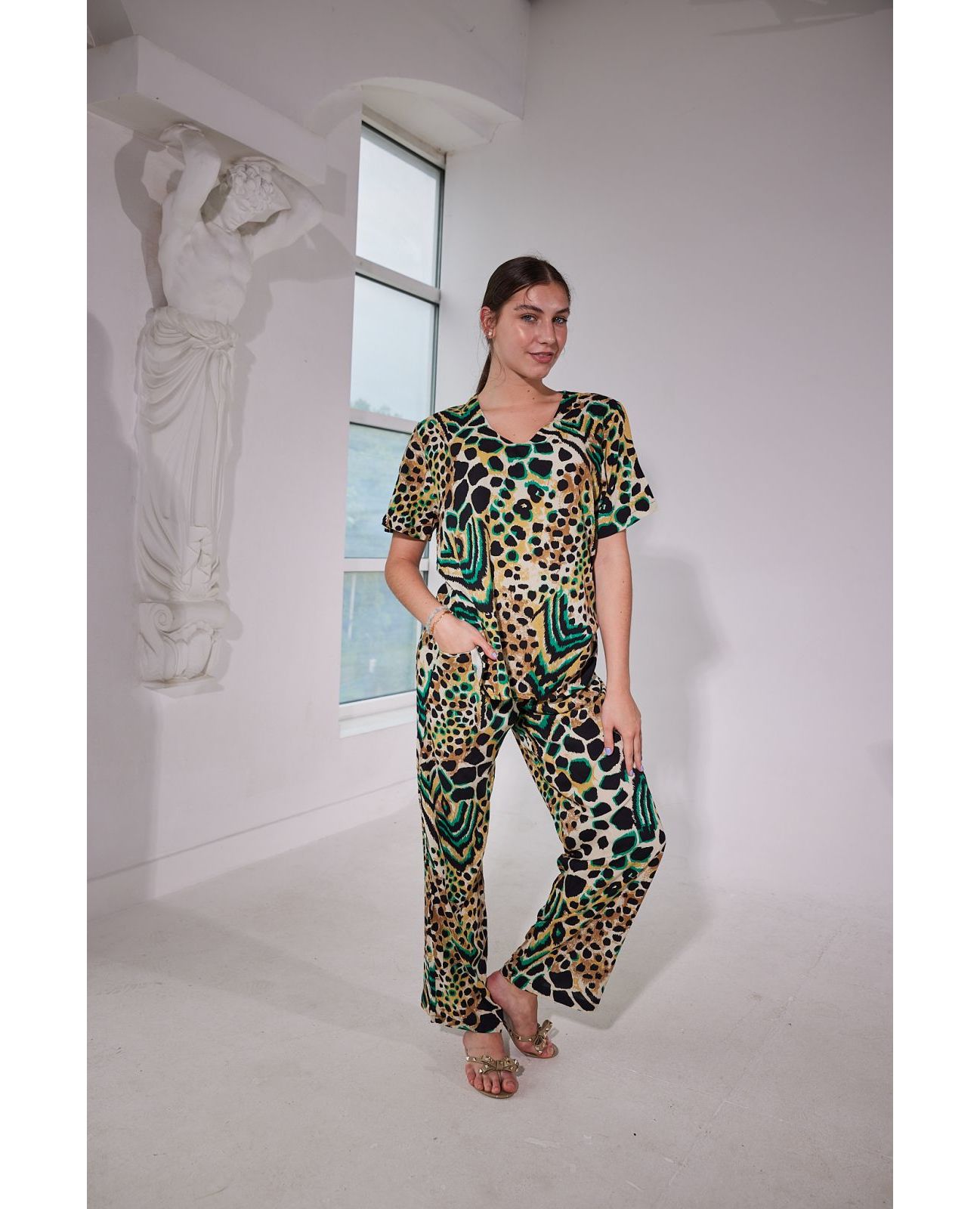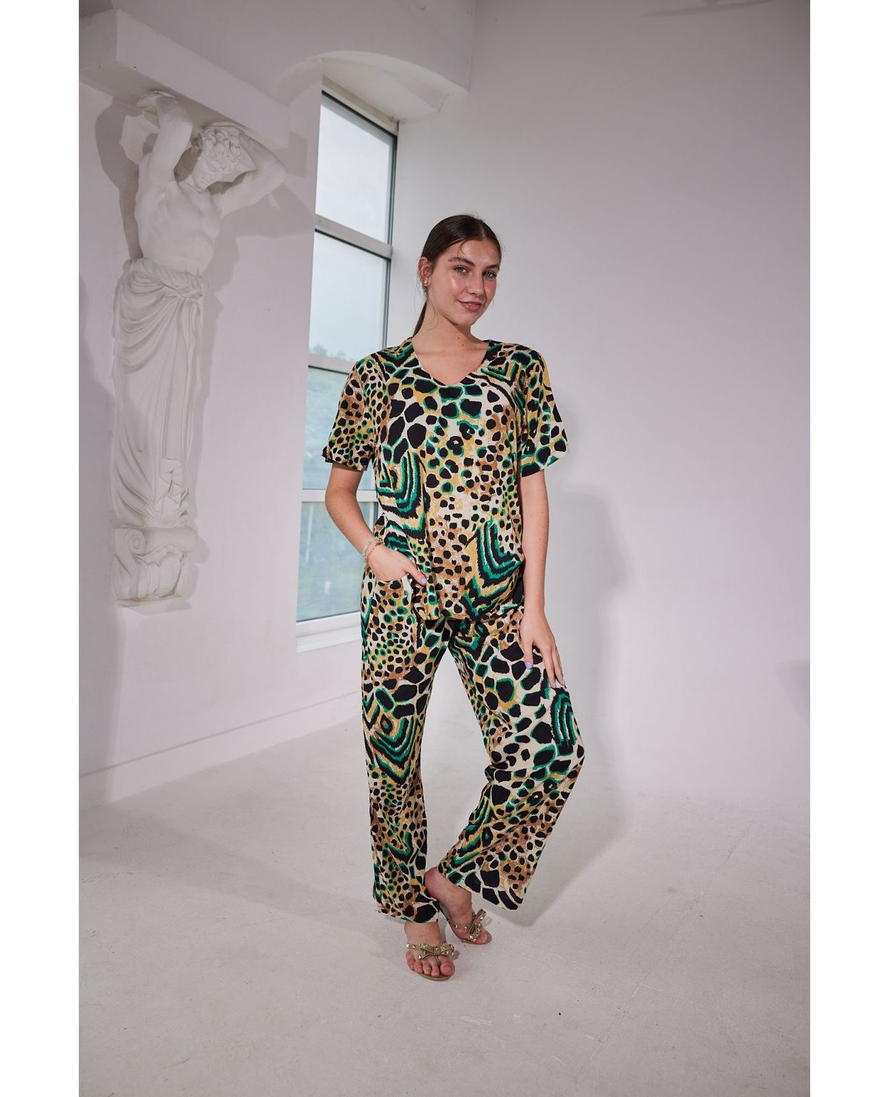 Домашний костюм футболка+штаны с леопардовым принтом. Футболка с V- образным выврезом, короткий рукав. Штаны на резинке, 2 кармана.