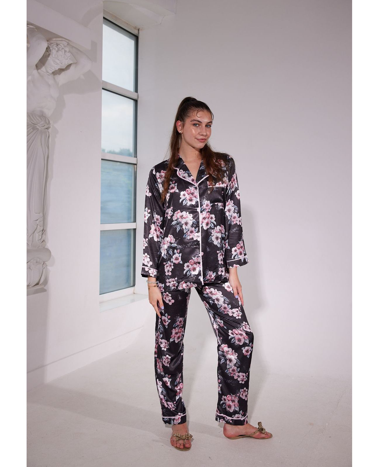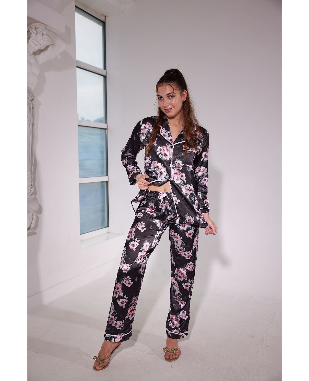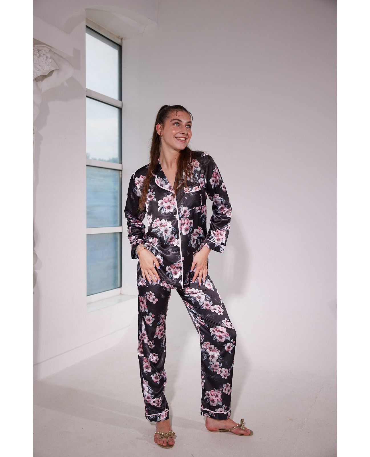 Домашний костюм рубашка+штаны. Рубашка с длинным рукавом на пуговицах с цветочным принтом. Штаны на резинке.