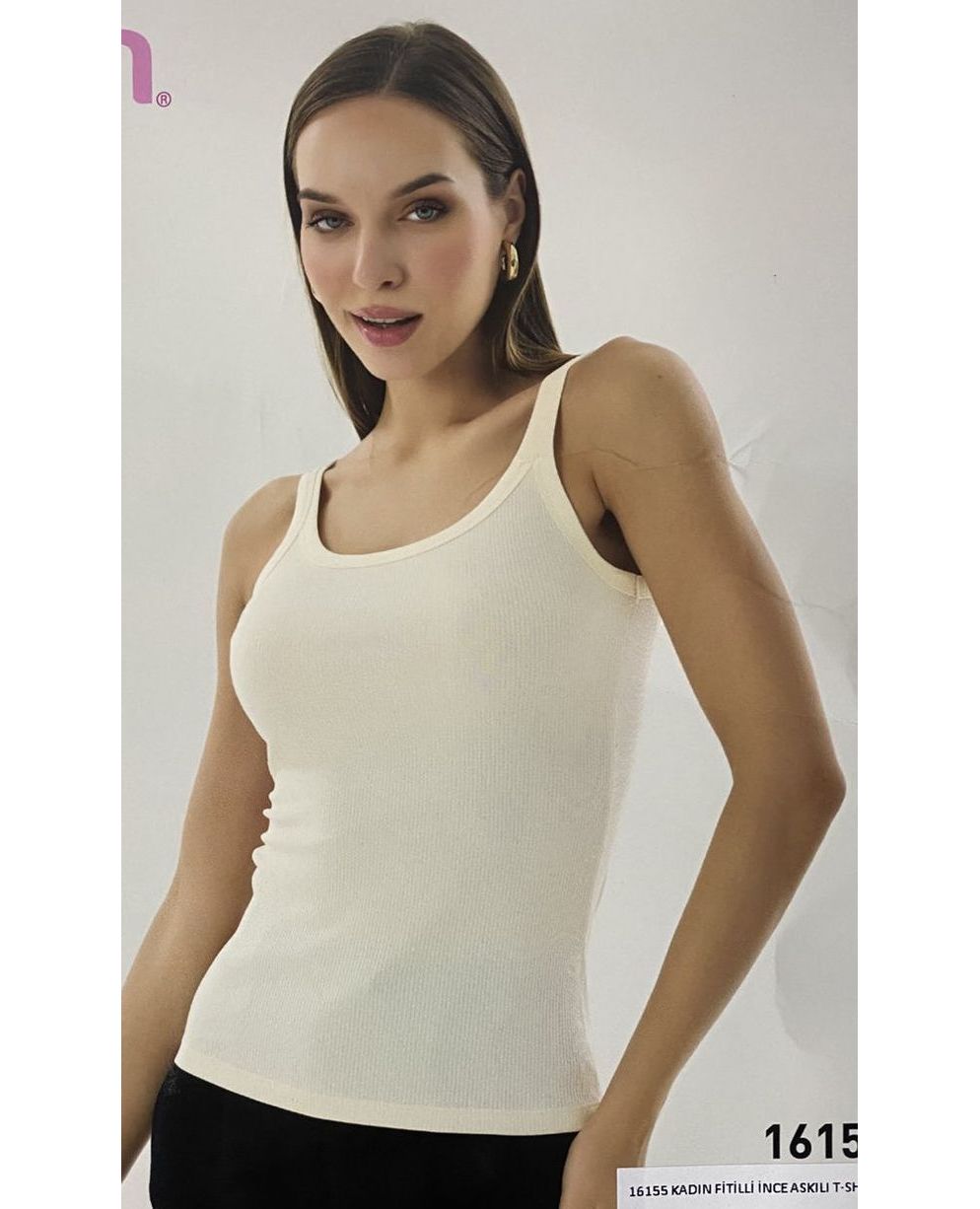 Ніжна жіноча майка на тонких бретельках у молочному кольорі чудово підходить для щоденного носіння. Натуральна бавовна дарує комфорт і приємні відчуття на тілі, а еластан забезпечує еластичність і гарну посадку.