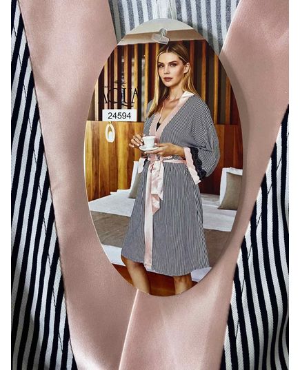 Халат жіночий на запах, виконаний у стильному поєднанні чорного та білого кольорів у смужку, оздоблений ніжним мереживом. Елегантна та жіночна модель, яка підкреслює фігуру й додає образу витонченості.
