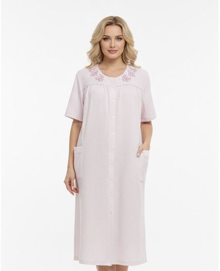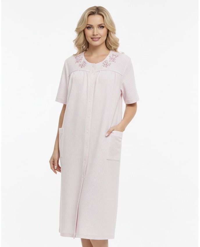 Халат жіночий на ґудзиках у ніжному рожевому кольорі, оздоблений витонченою вишивкою. Жіночна та зручна модель, яка ідеально підходить для домашнього комфорту та щоденного використання.