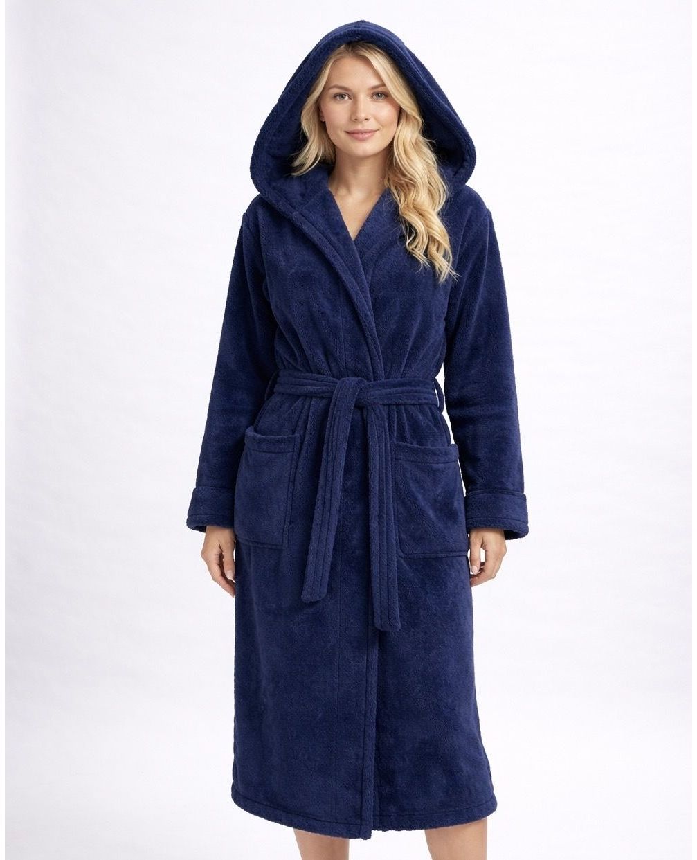 Затишний синій халат із м’якої махрової тканини стане ідеальним вибором для дому та відпочинку. Модель на запах із поясом забезпечує зручну посадку, а капюшон додає додаткового комфорту та тепла. Легка й практична тканина приємна у використанні та проста у догляді.