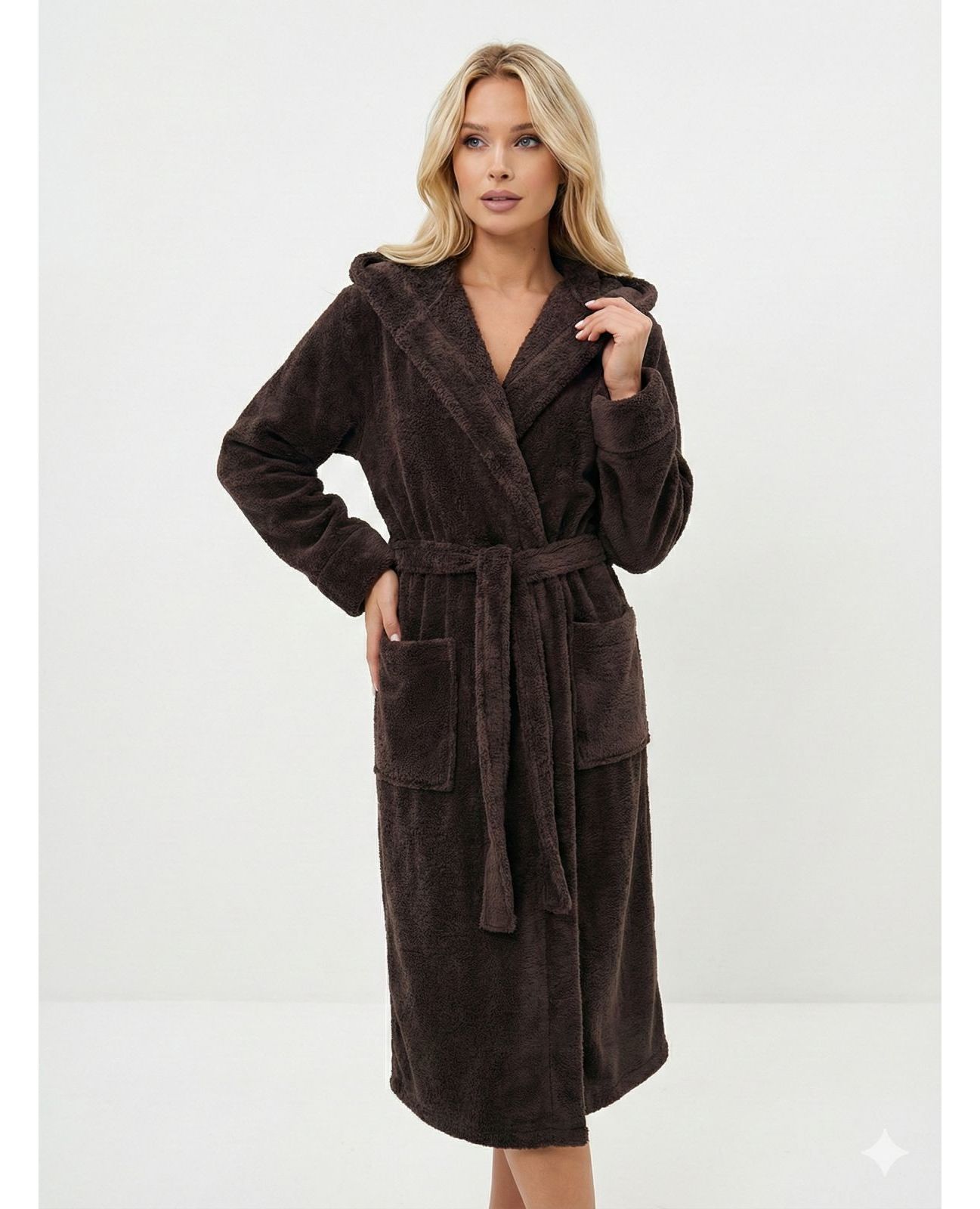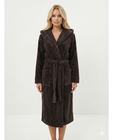 Затишний коричневий халат із м’якої махрової тканини ідеально підходить для домашнього відпочинку та теплих вечорів. Модель на запах із поясом забезпечує комфортну посадку, а капюшон додає додаткового тепла та затишку. Практична тканина легко доглядається та приємна до тіла.