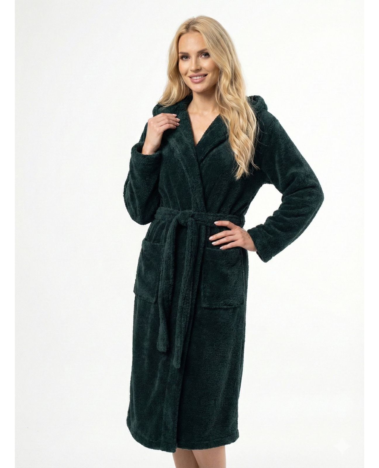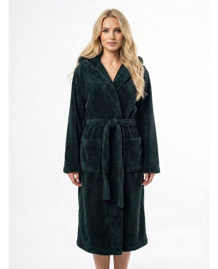 Жіночий махровий халат з капюшоном на запах зеленого кольору