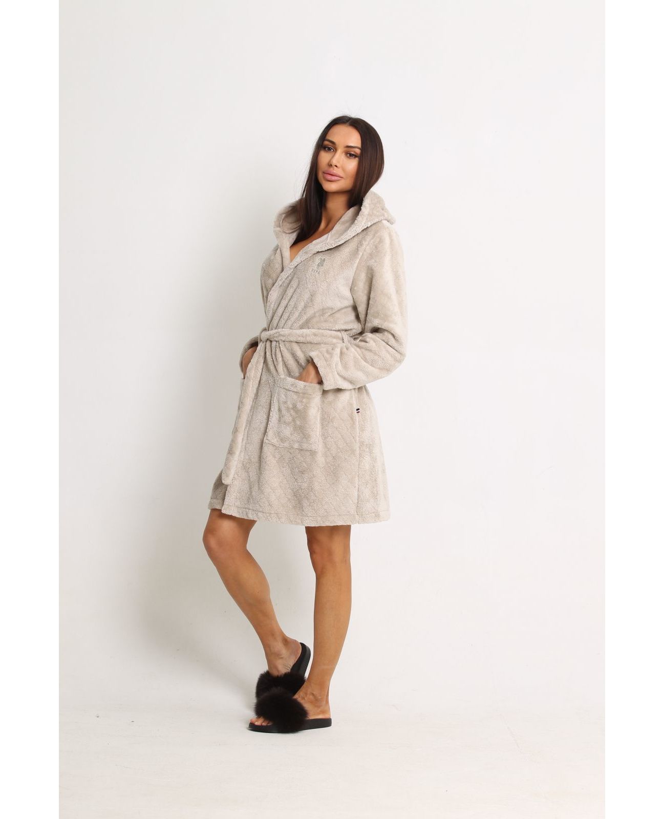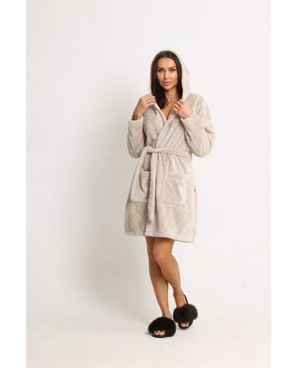 Жіночий короткий махровий халат на запах з капюшоном у ніжному бежевому кольорі. Зручна та практична модель, ідеальна для використання після душу або ванни, а також для домашнього відпочинку. Махрова тканина м’яка, добре вбирає вологу та дарує відчуття затишку.