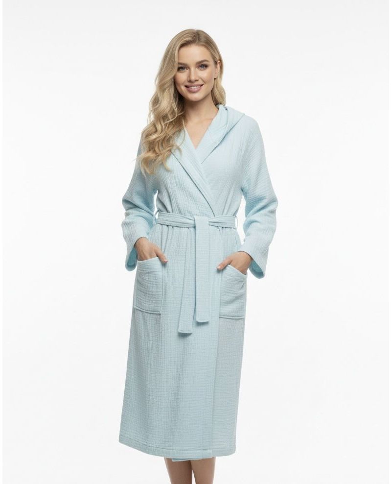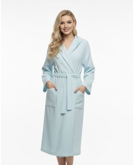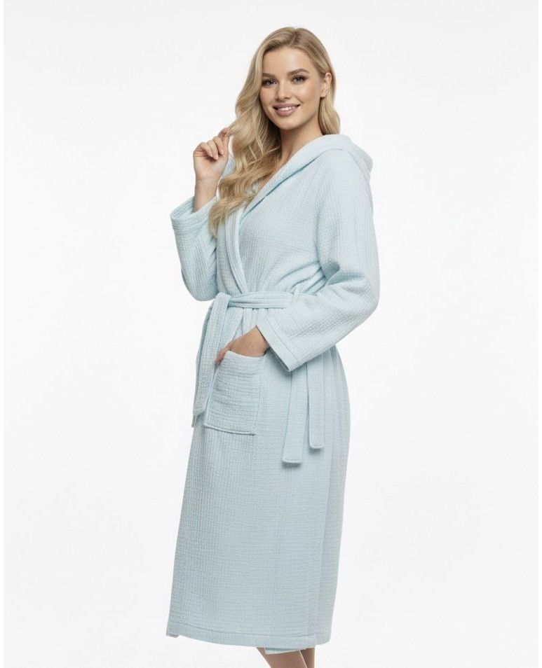 Жіночий халат на запах з капюшоном блакитного кольору — комфортний та практичний варіант для домашнього використання. Виготовлений зі 100% бавовни, халат м’який, приємний до тіла та добре пропускає повітря, забезпечуючи зручність протягом усього дня. Модель на запах легко регулюється по фігурі, а капюшон додає додаткового затишку.