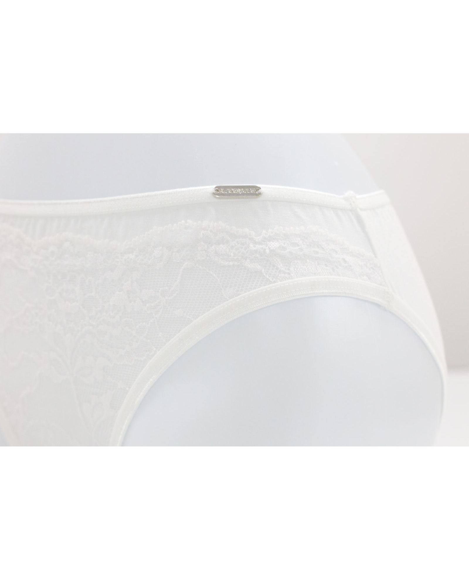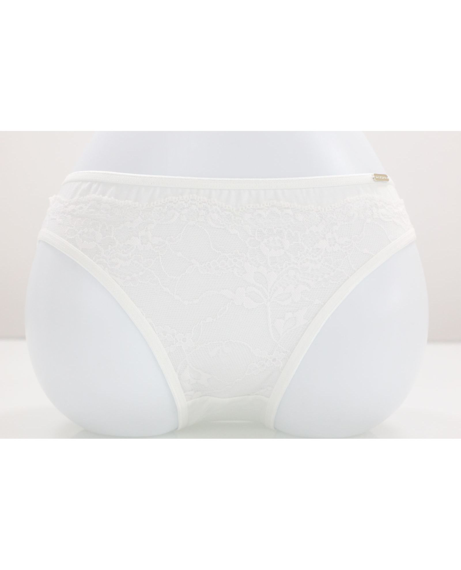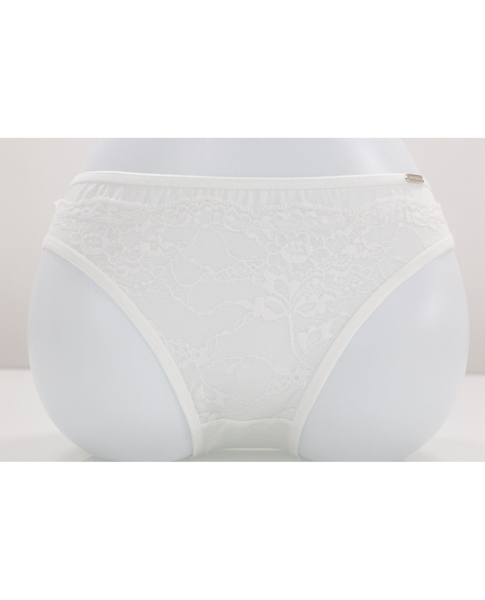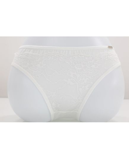 Жіночі плавки білого кольору, оздоблені ніжним мереживом. Модель поєднує елегантний дизайн і комфортну посадку, забезпечуючи приємні відчуття протягом усього дня. М’який модаль у складі робить їх приємними до тіла, а еластан гарантує еластичність і довговічність.