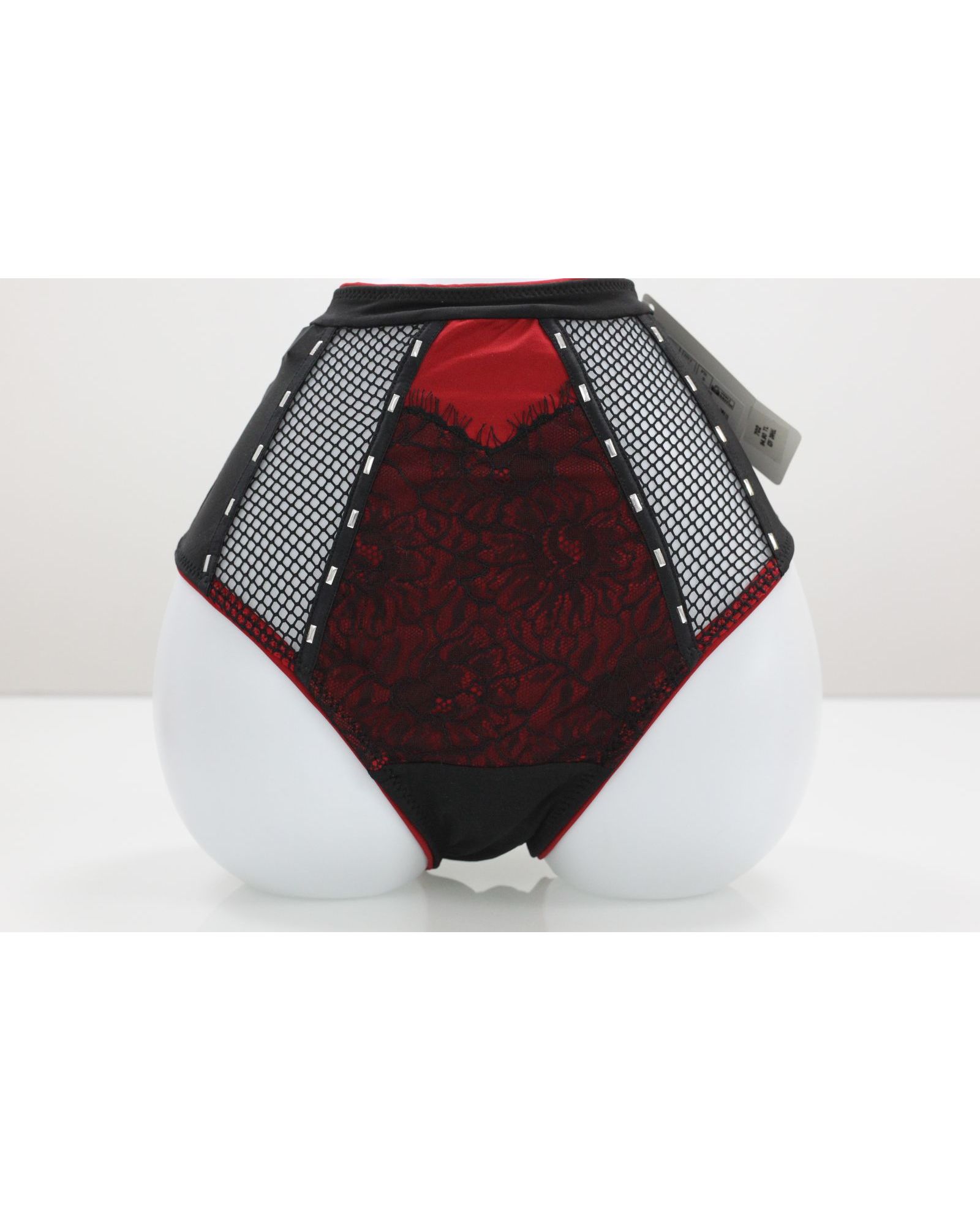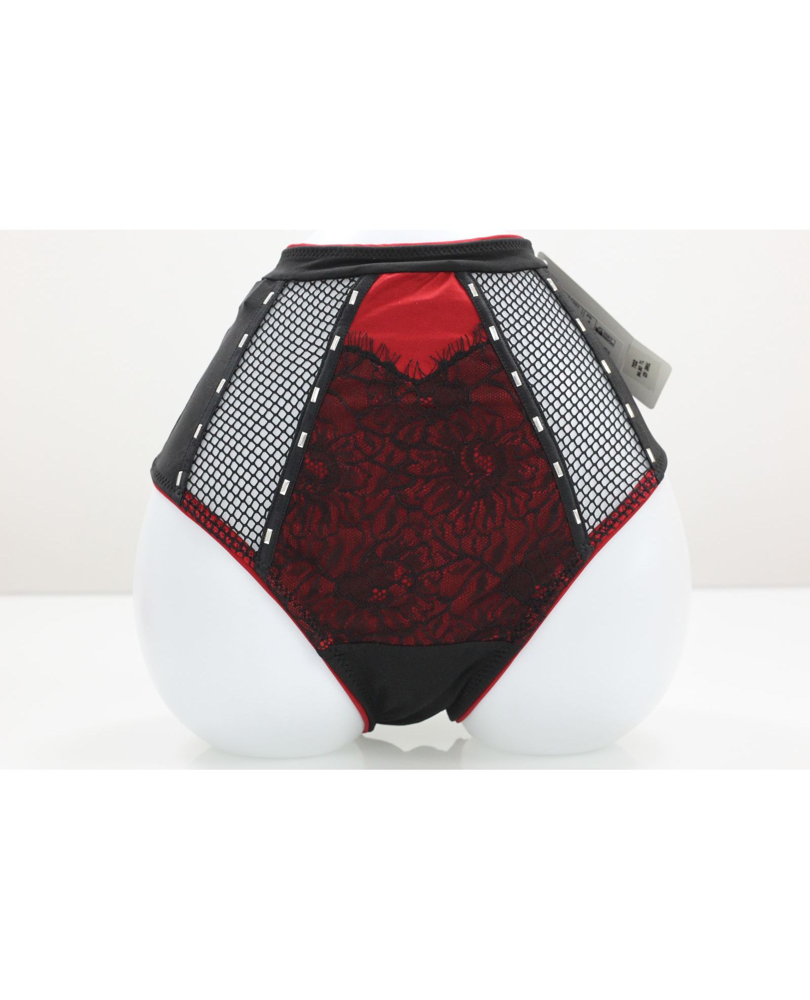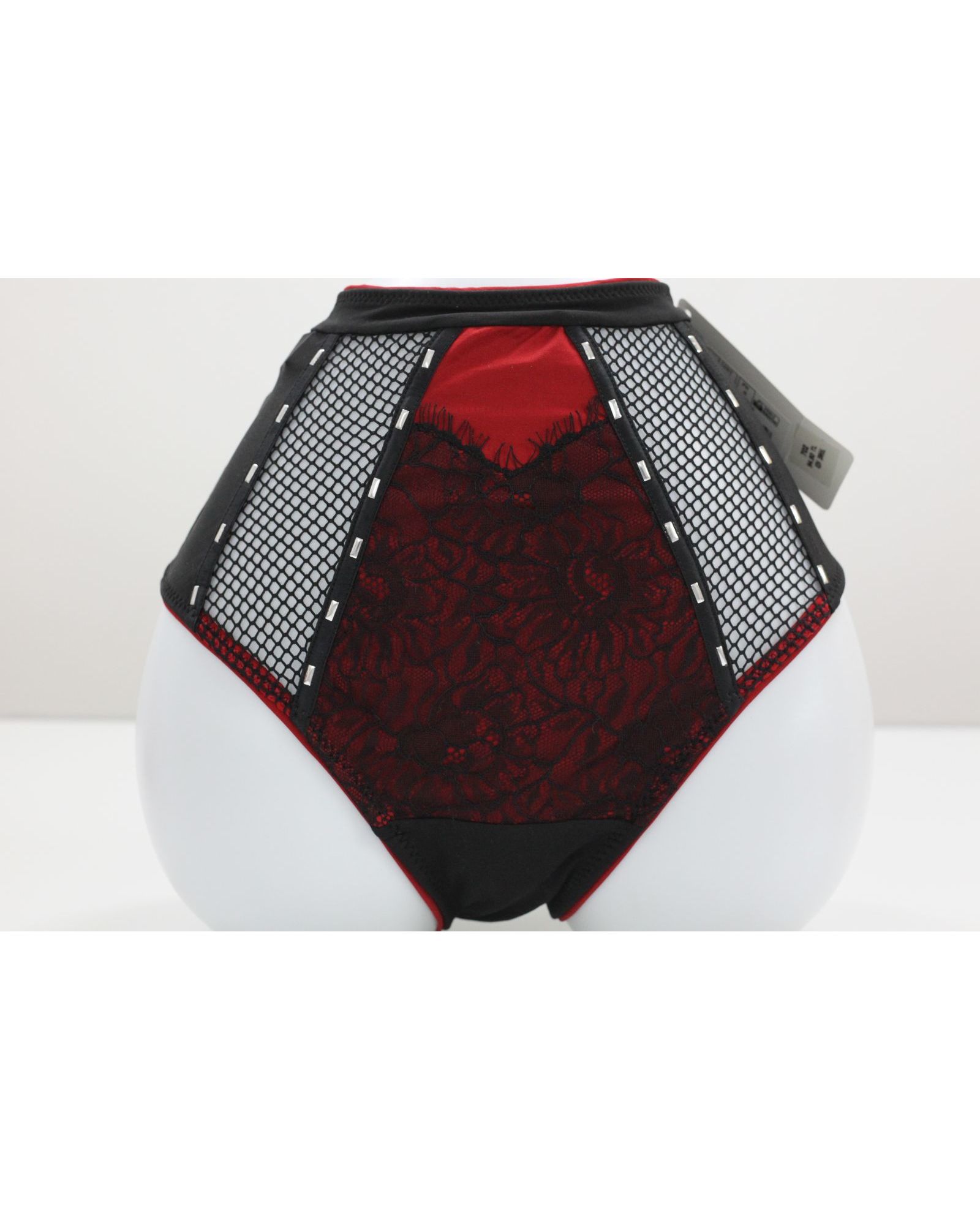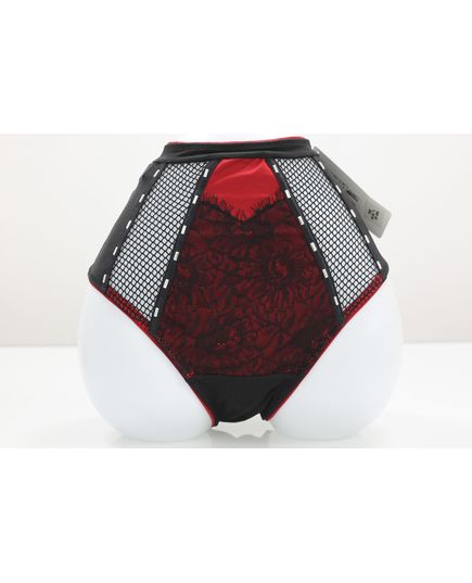 Жіночі плавки чорного кольору з червоним та мереживним оздобленням
