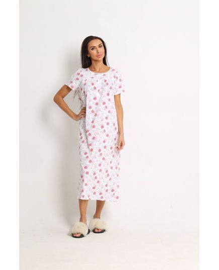 Витончена довга нічна сорочка у білому кольорі створена для комфортного та приємного сну. Модель із короткими рукавами оздоблена ніжним мереживом та квітковим принтом, що додає образу романтичності та жіночності. Натуральна бавовна забезпечує м’якість і дозволяє шкірі дихати.