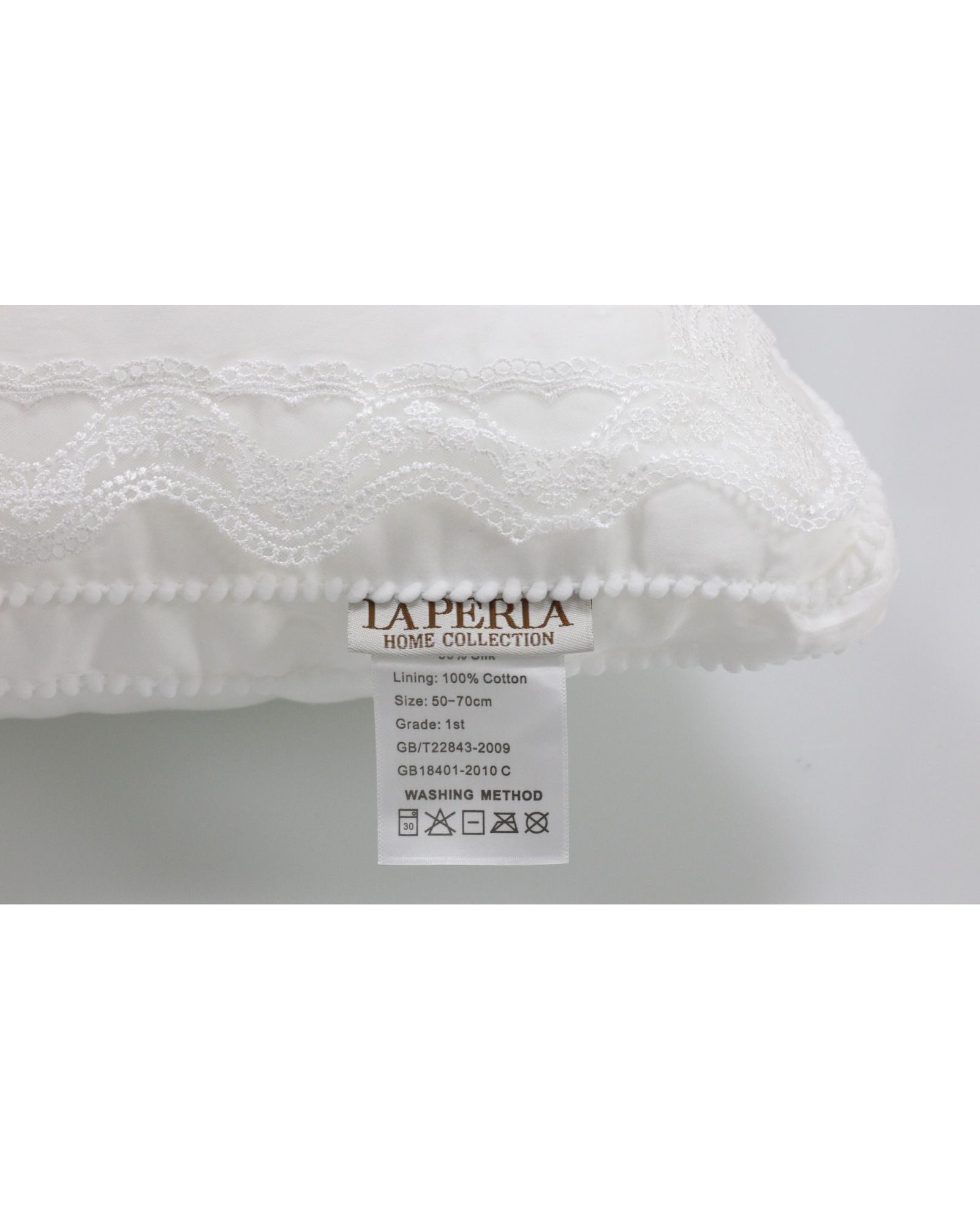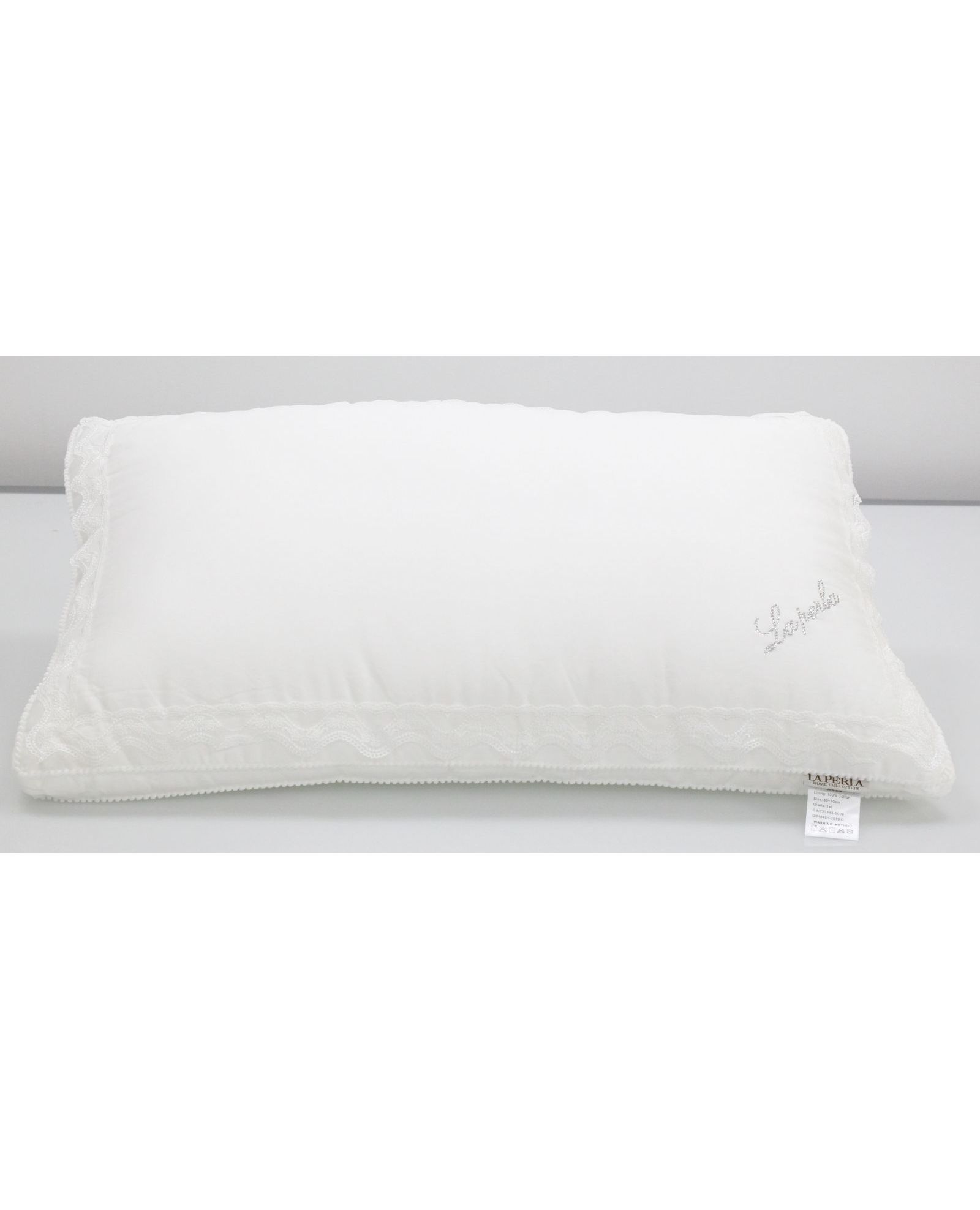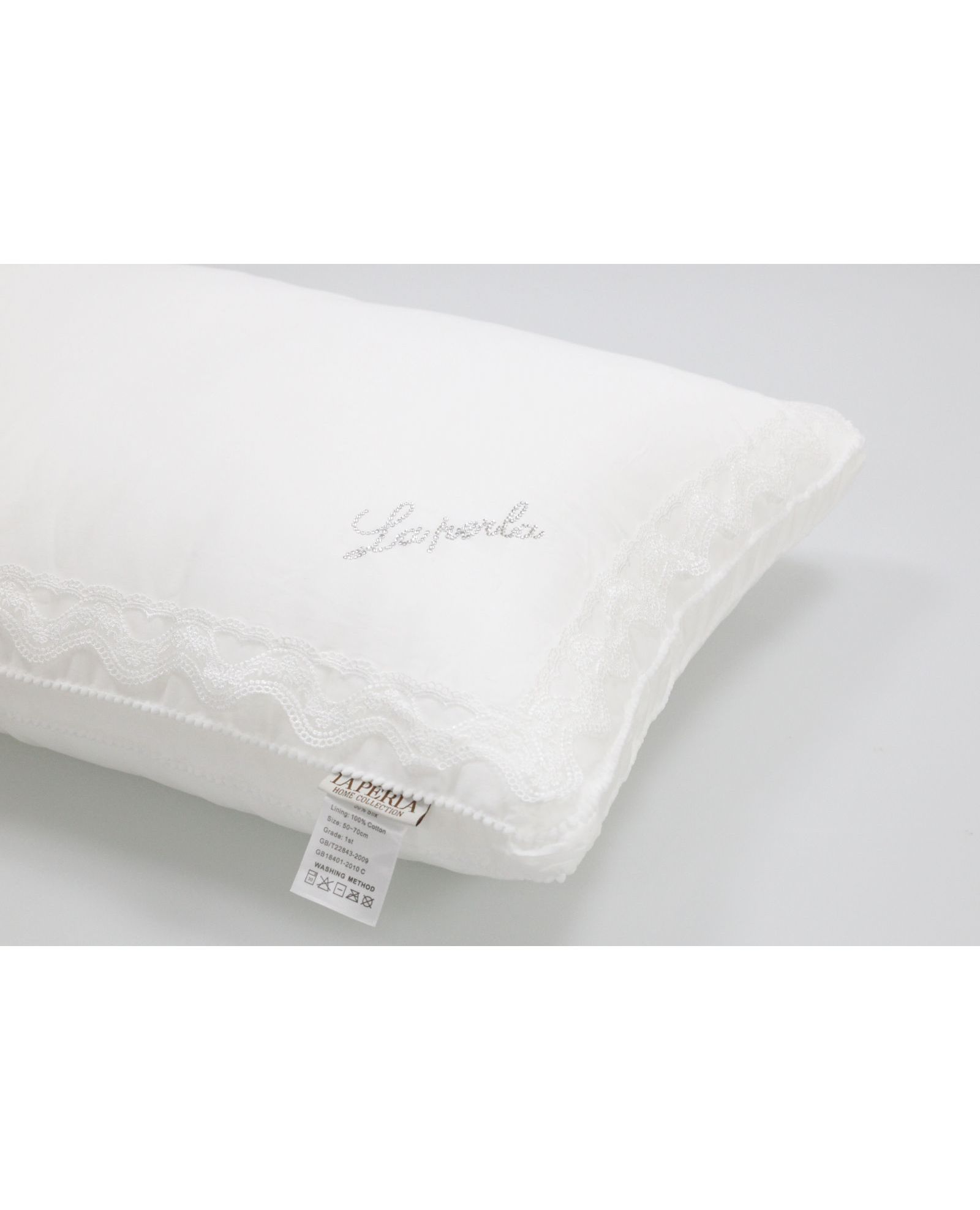 Подушка LAPERLA 50х70 см – це ідеальне поєднання розкоші та природного затишку. Натуральний чохол із 100% бавовни приємний на дотик, а наповнювач із бамбукового волокна (50%) та шовку (50%) забезпечує м'якість, дихаючий ефект та оптимальну підтримку під час сну. Вишукане мереживо та логотип бренду, викладений стразами, додають елегантності.