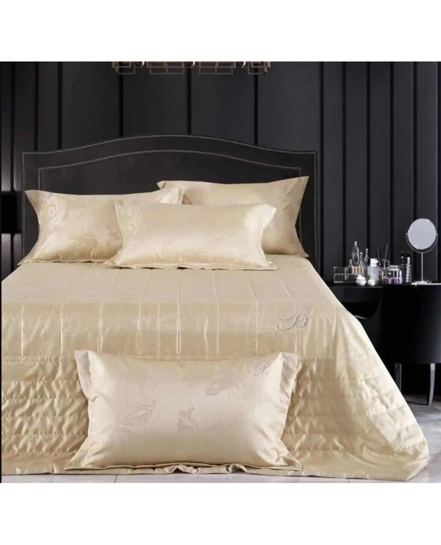 Вишукане стьобане покривало від італійського бренду Blumarine стане справжньою окрасою вашої спальні. Ніжний бежевий колір створює атмосферу затишку та гармонії, а фірмовий логотип, прикрашений стразами, додає виробу елегантного блиску та розкішного вигляду.