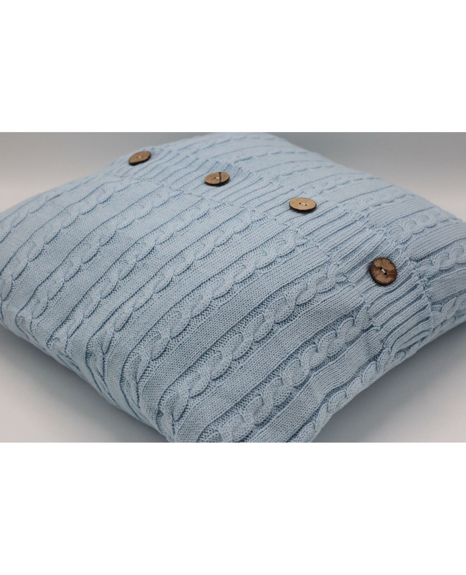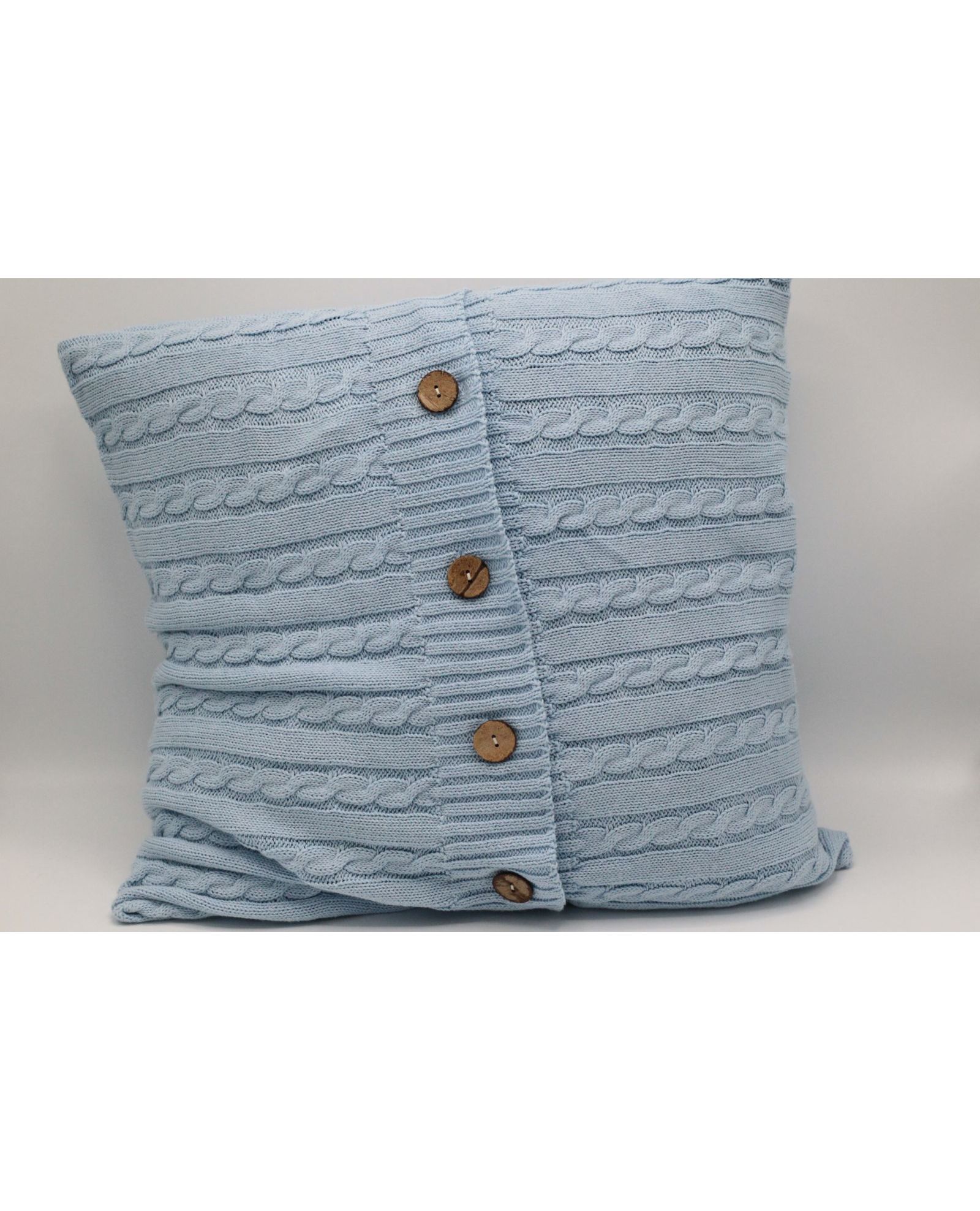 Эта стильная вязаная наволочка бледно-голубого цвета станет отличным дополнением вашего интерьера. Изготовленная из акрила, она мягкая и приятная на ощупь, а пуговицы придают ей элегантный вид. Наволочка подойдет как для классических, так и для современных интерьеров, добавляя уют и тепло в любое пространство.