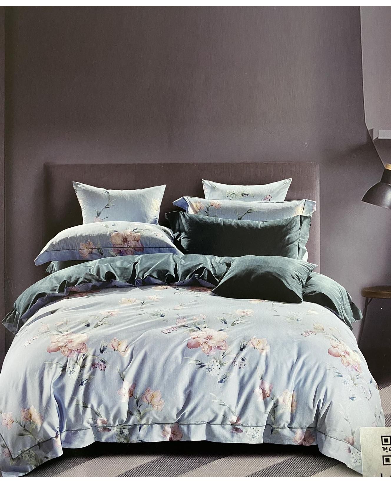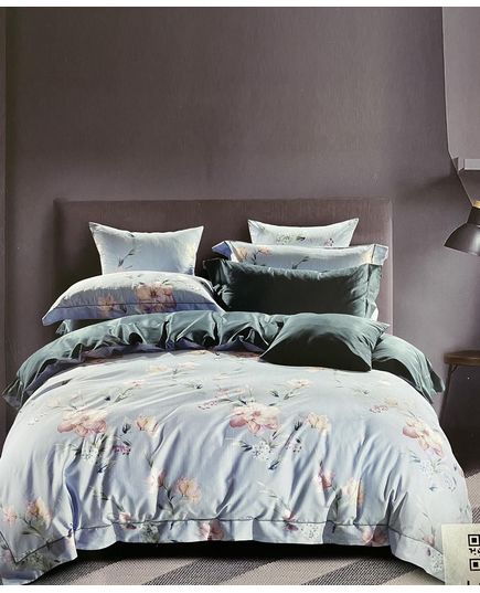 Нежное сочетание зелёного и голубого оттенків с цветочным рисунком наполняет спальню свежестью и спокойствием. Благодаря натуральному составу, бельё KuNmeng обеспечивает приятные ощущения и комфортный сон.