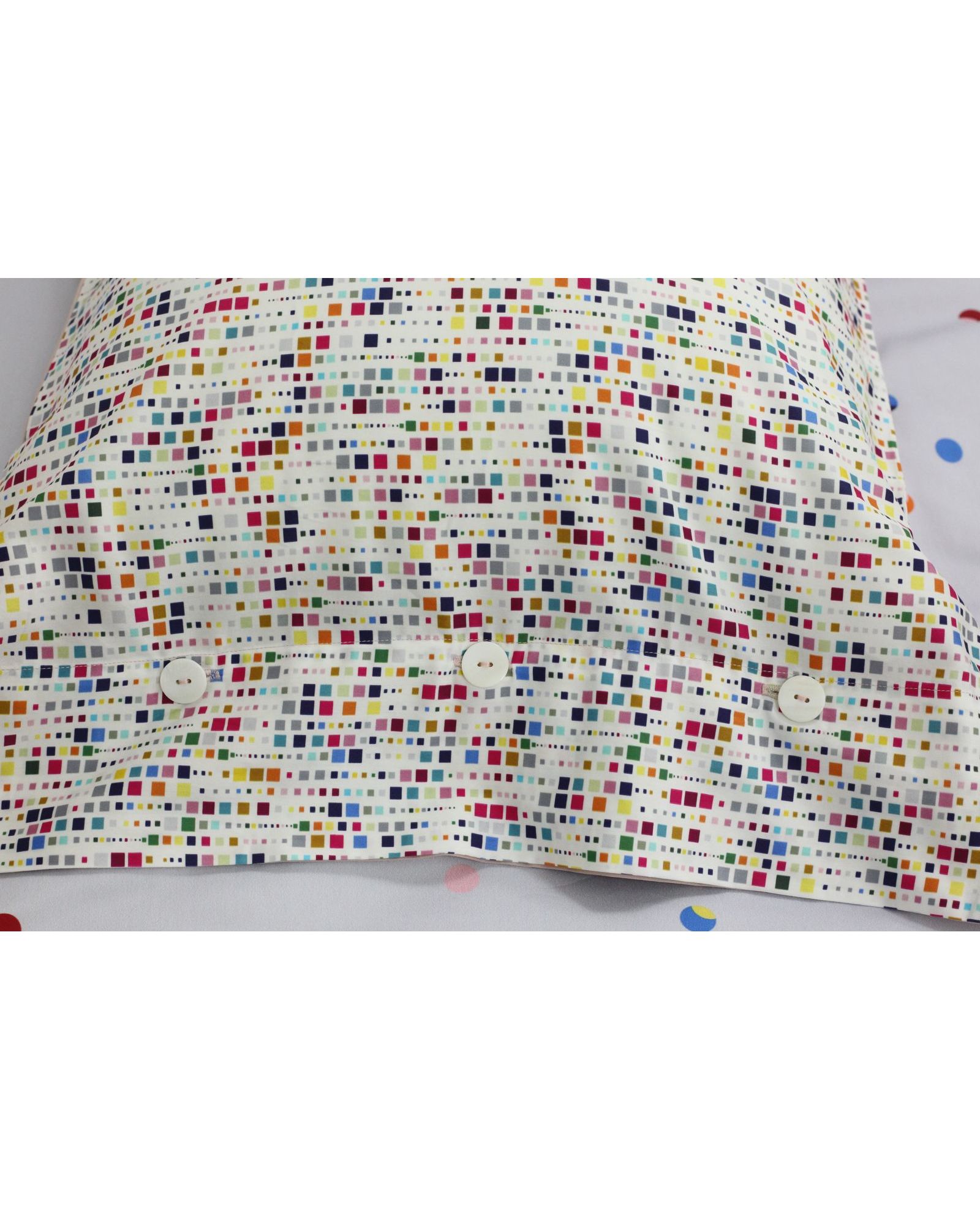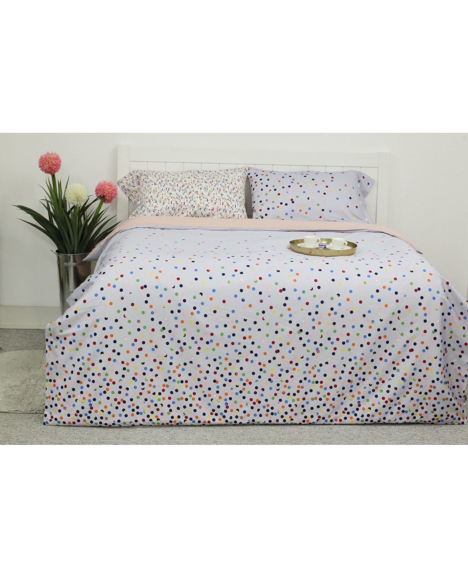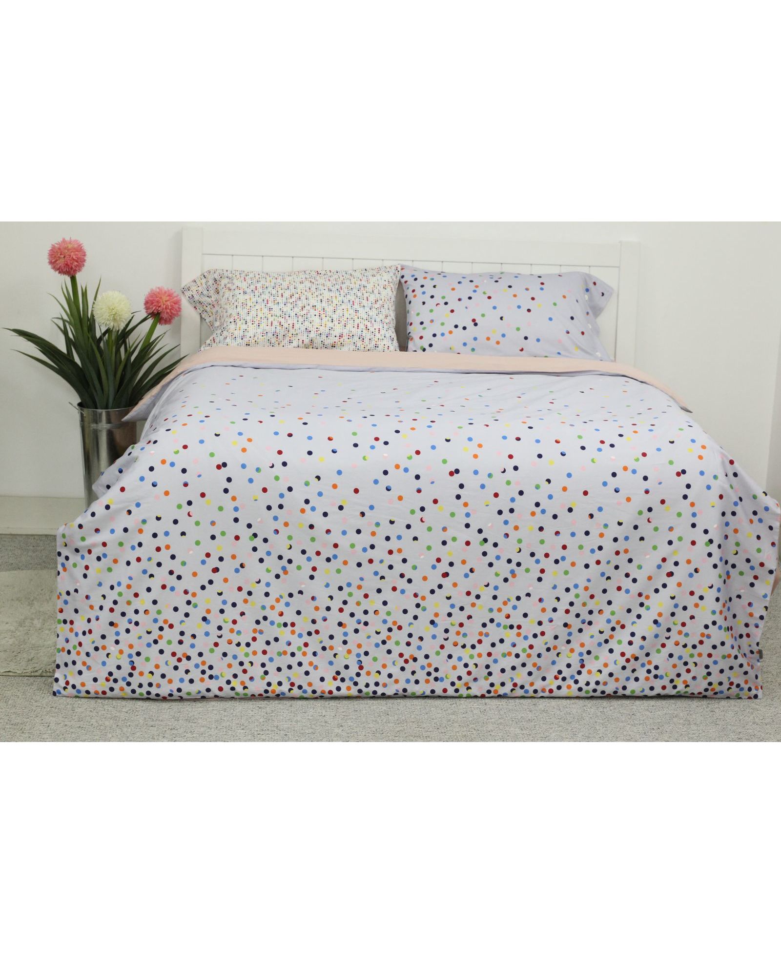 Яркий и одновременно сдержанный комплект постельного белья из 100% хлопка украсит вашу спальню и подарит комфорт. Серо-бежевый фон с разноцветным горошком создаёт живую, игривую атмосферу, а натуральная ткань обеспечивает мягкость и воздухопроницаемость.