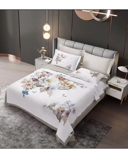 Белый фон и зелёный цветочный принт наделяют спальню лёгкостью и спокойствием. Сатин De Lux подарит нежные тактильные ощущения и стильный внешний вид постели.