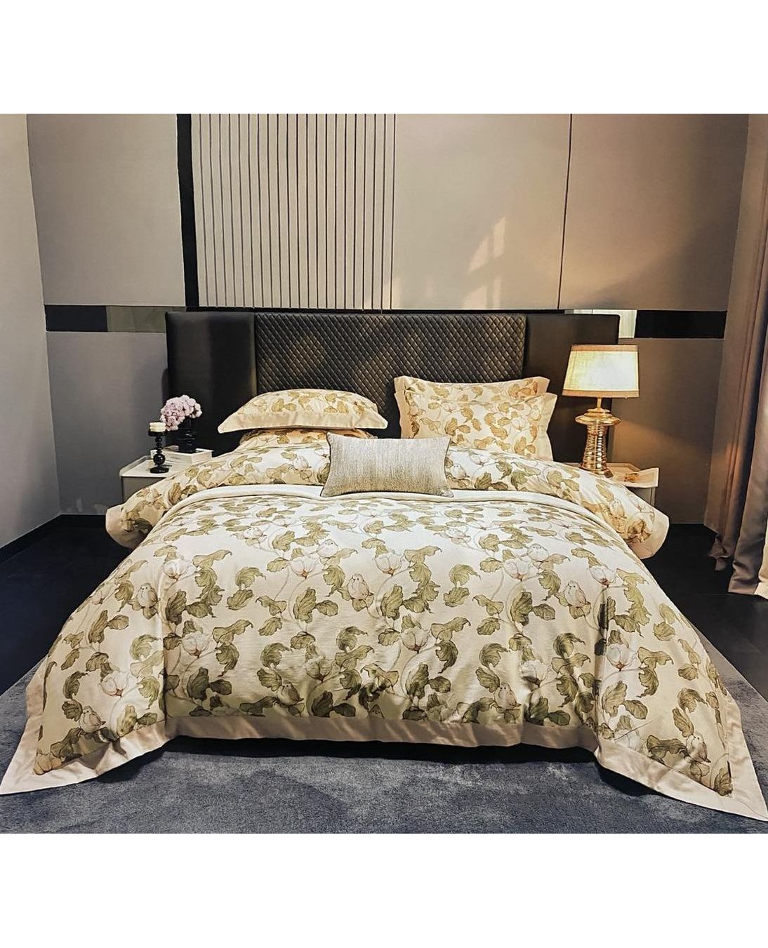 Нежный бежевый оттенок и утончённый растительный рисунок наполняют спальню ощущением уюта и естественной гармонии. Египетский хлопок обеспечивает мягкость, прочность и идеальную циркуляцию воздуха.