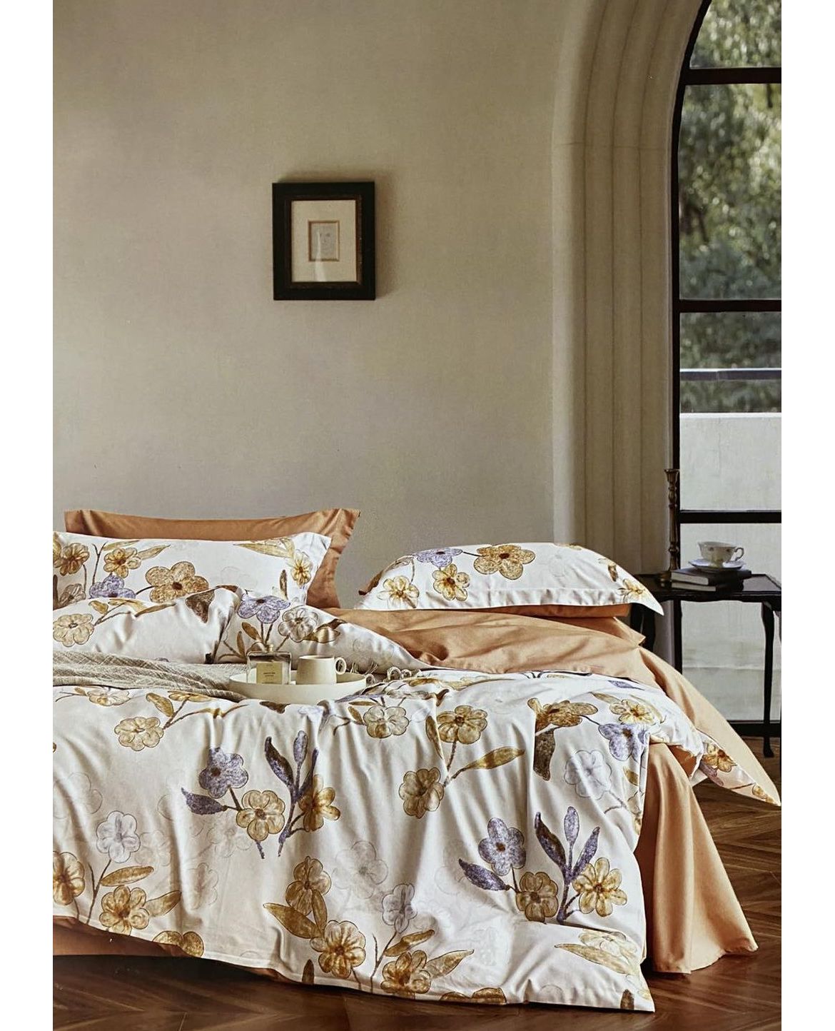 Комплект постельного белья нежного персикового цвета с элегантным цветочным принтом наполнит вашу спальню теплом и уютом. Изготовлен из 100% тёплого хлопка, он приятен на ощупь, хорошо сохраняет тепло и дарит комфортный сон в прохладные ночи.