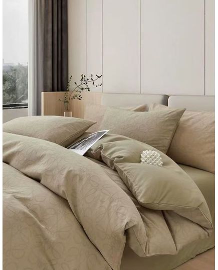 Оттенок цвета хаки, с утончённым жаккардовим узором придаёт спальне сдержанную элегантность и уют. Натуральный хлопок дарит телу мягкость, дышащие свойства и комфорт на протяжении всей ночи.