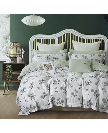 Благородный оттенок полыни в поєднании с белым и цветочным принтом придаёт спальне лёгкость и гармонию. Сатиновая ткань создаёт ощущение уюта и нежности.
