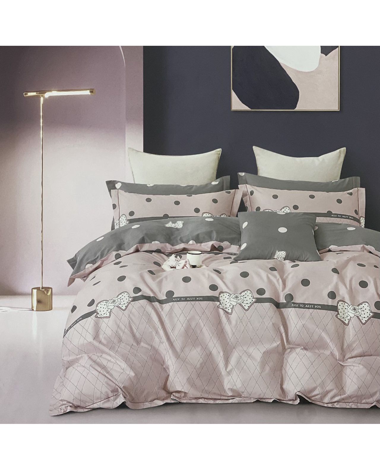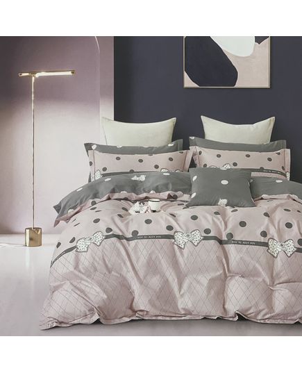 Сдержанная серая гамма в сочетании с розовыми акцентами и утончённым узором создаёт элегантный и уютный стиль спальни. Ткань из натурального сатина обеспечивает мягкость и комфорт.