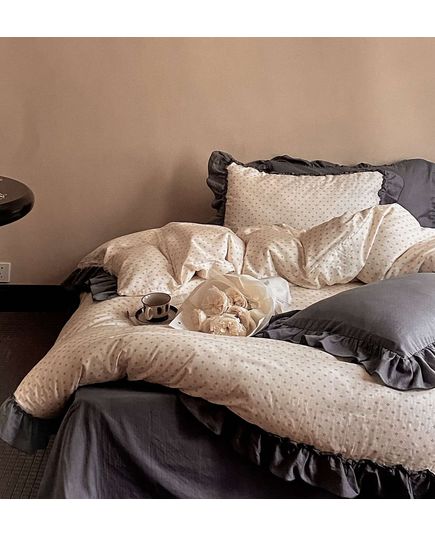 Сдержанное сочетание молочного и серого цветов с изысканным узором и романтичными рюшами на пододеяльнике и наволочках придаёт спальне лёгкость и уют. Муслин — натуральная, мягкая и дышащая ткань, идеально подходящая для ежедневного комфорта.