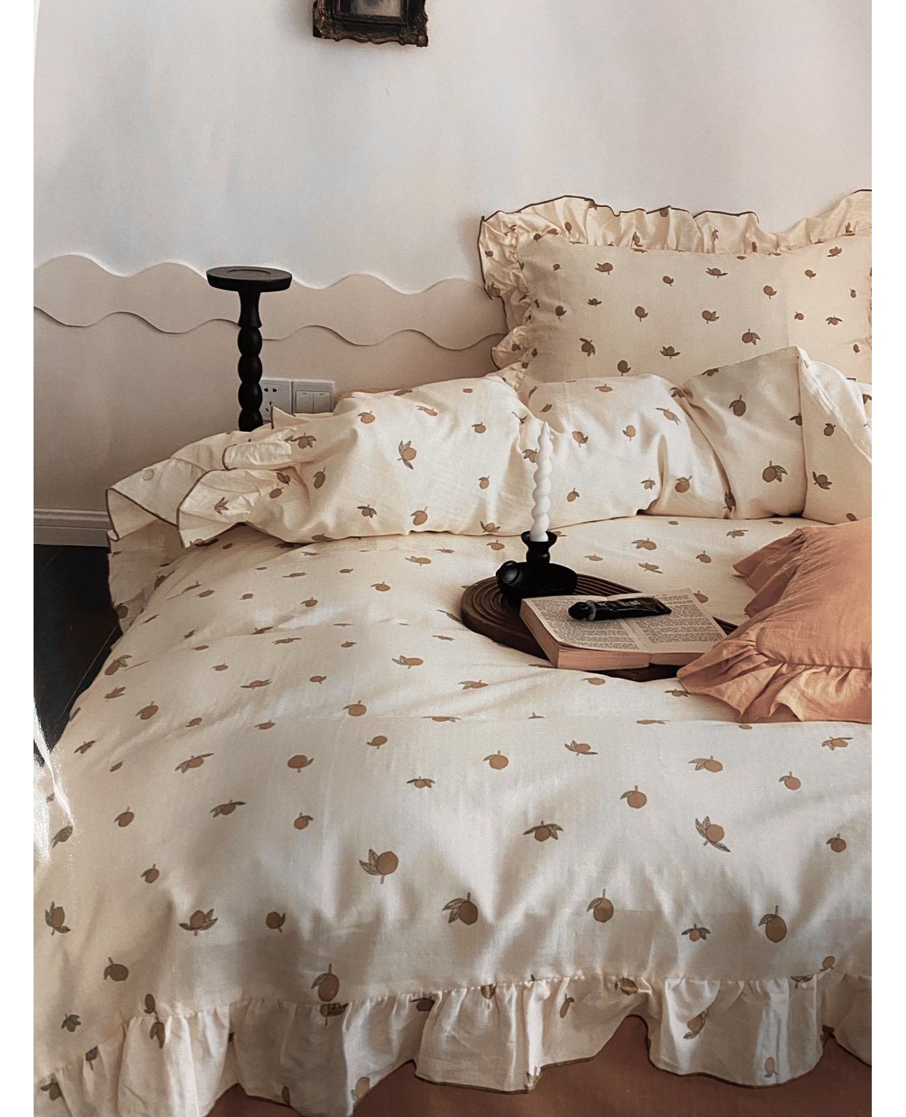 Комплект постельного белья из муслина молочно-горчичного цвета с растительным принтом и рюшами