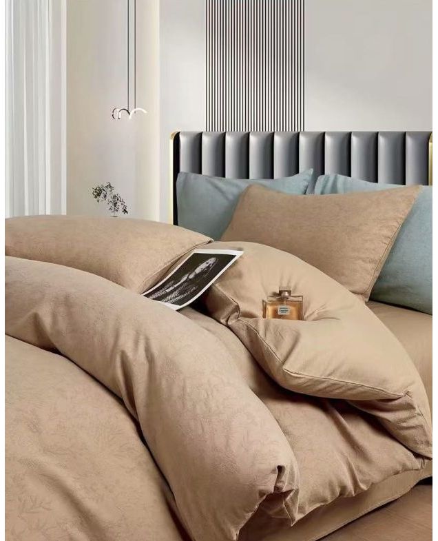 Оттенок песочного цвета, с утончённым жаккардовим узором придаёт спальне сдержанную элегантность и уют. Натуральный хлопок дарит телу мягкость, дышащие свойства и комфорт на протяжении всей ночи.