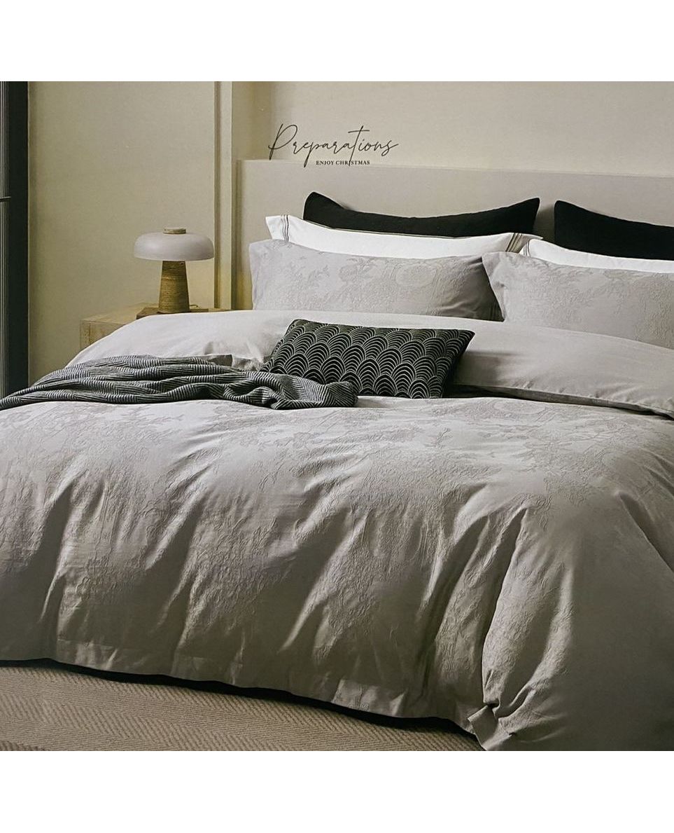 Серый оттенок с утончённым жакардовим узором придаёт спальне сдержанную элегантность и уют. Натуральный хлопок дарит телу мягкость, дышащие свойства и комфорт на протяжении всей ночи.