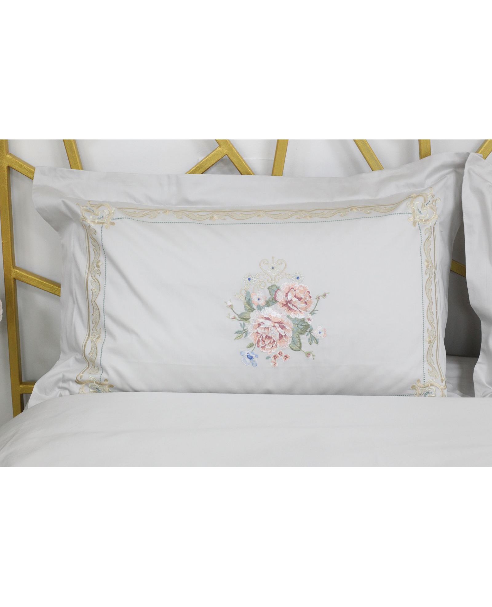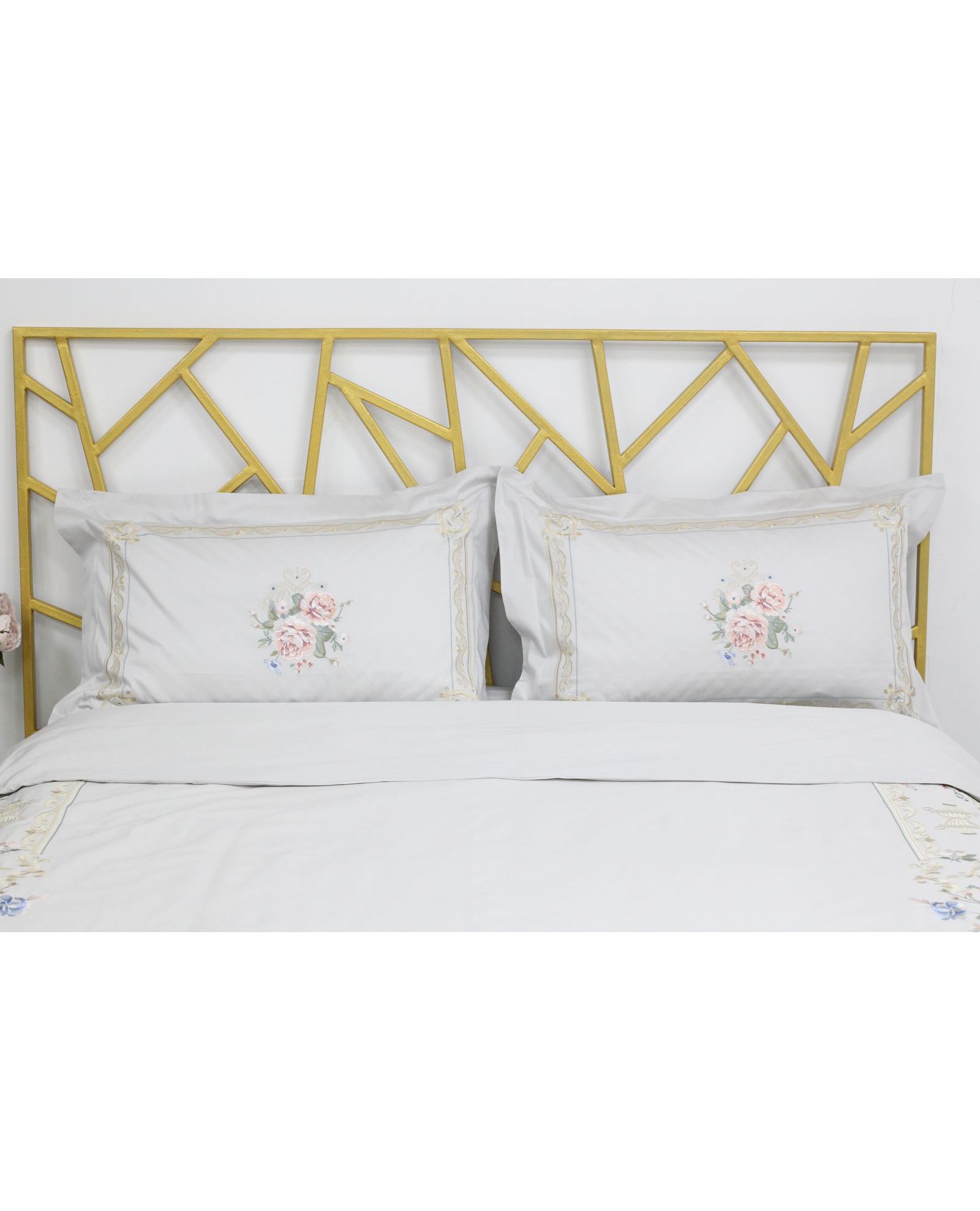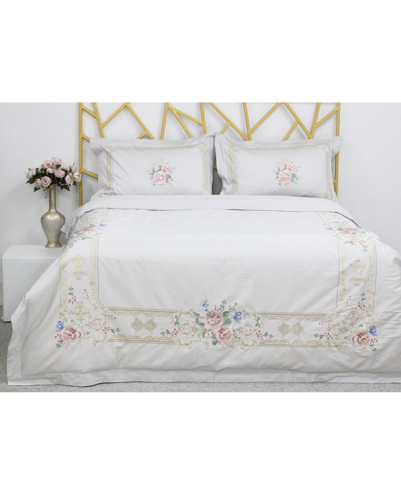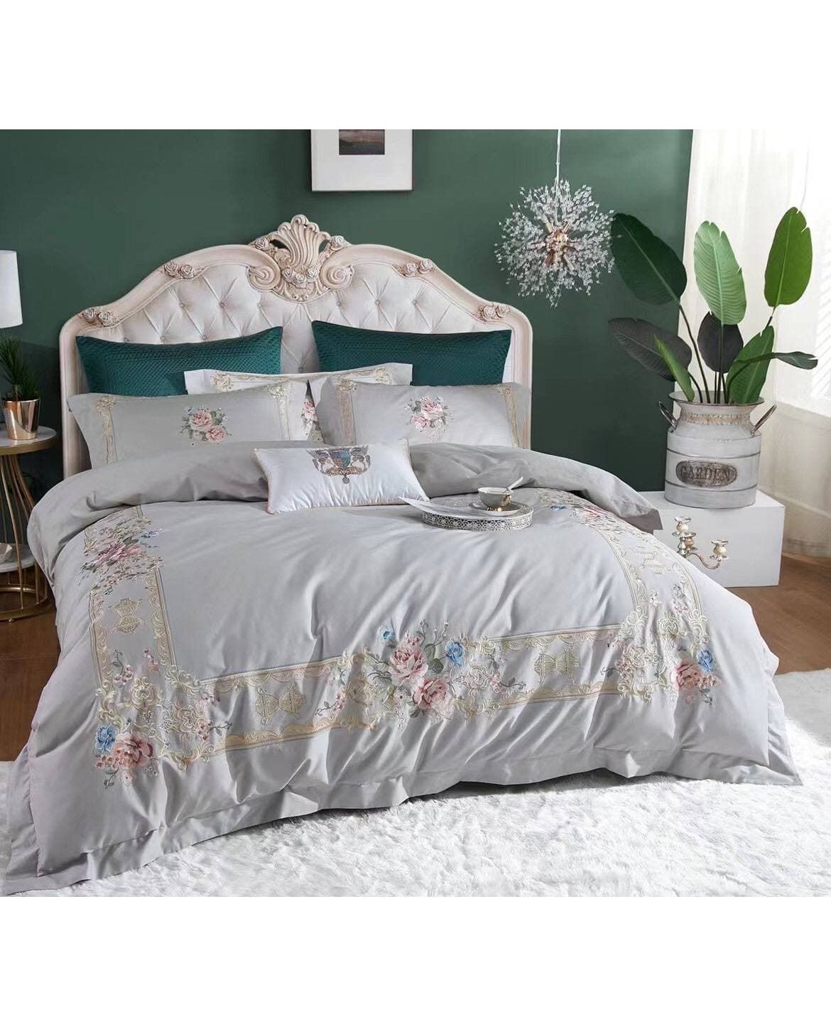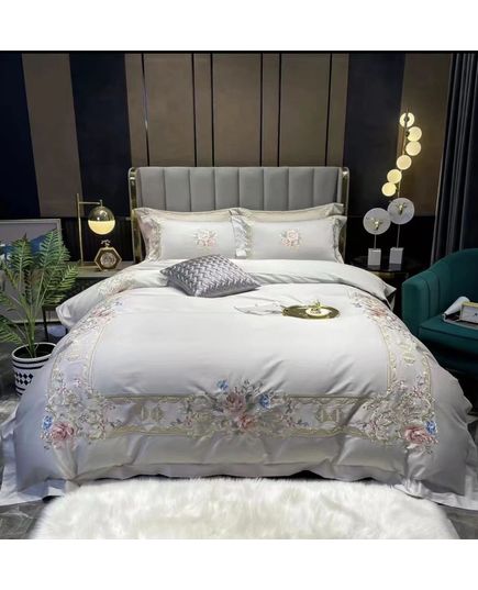 Комплект постельного белья светло-серого цвета украшен изысканной вышивкой