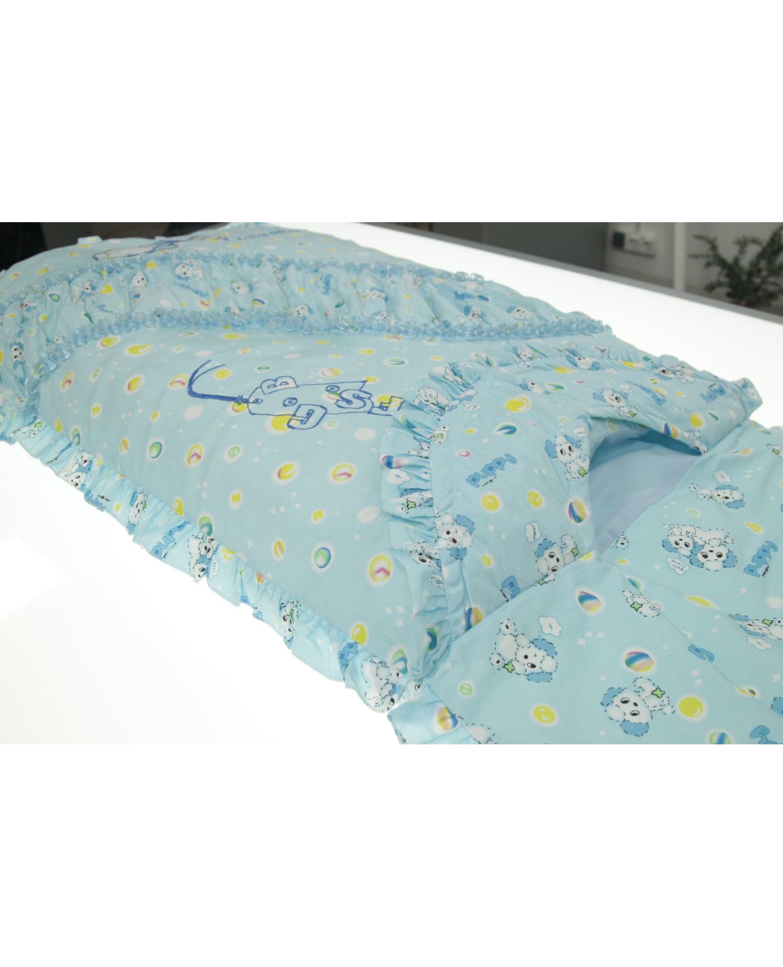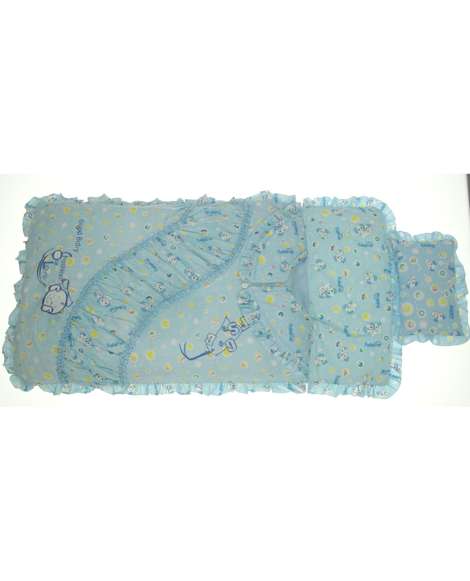 Уютный и нарядный комплект для новорождённого: одеяло-конверт размером 60×115 см и подушка 20×30 см. Верх изделия выполнен из натурального хлопка, наполнитель — лёгкий синтепон, который хорошо сохраняет тепло. Голубой цвет и нежные рюши делают комплект не тільки практичным, але й святковим.