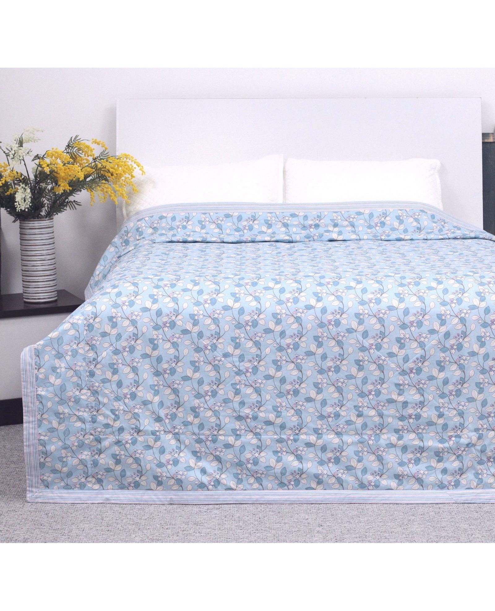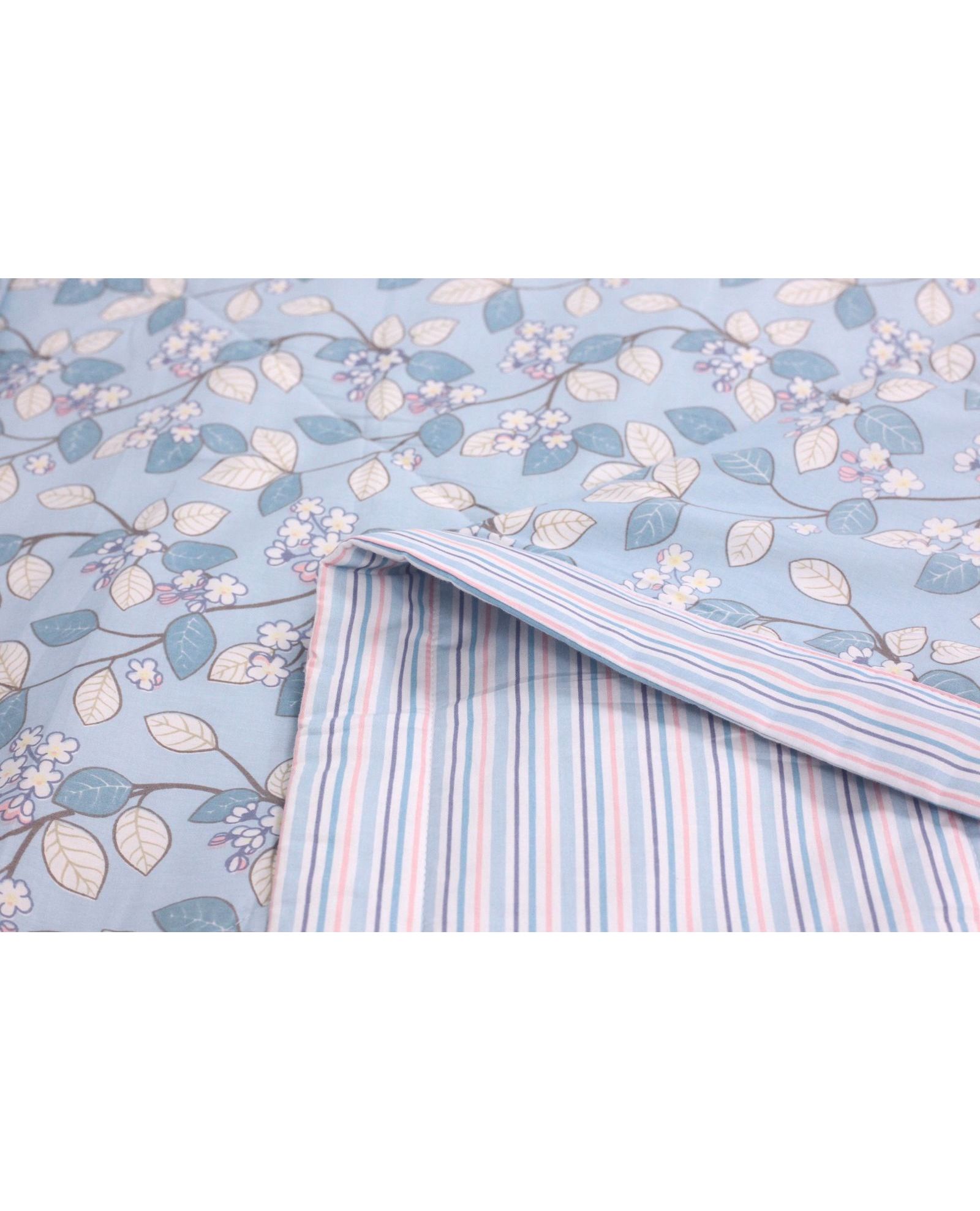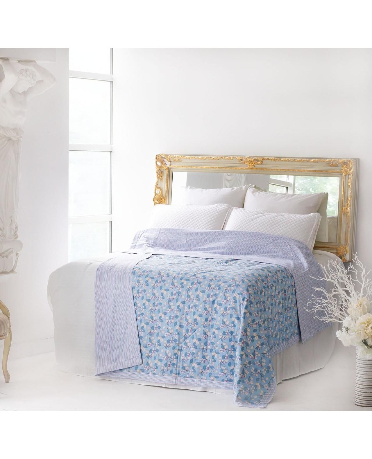 Нежное и воздушное одеяло с цветами голубого цвета подарит уют и комфорт в тёплу пору року. Благодаря стёганой конструкции наполнитель не сбивается и сохраняет форму. Выполнено из 100% хлопка — дышащий и приятный к телу материал.
