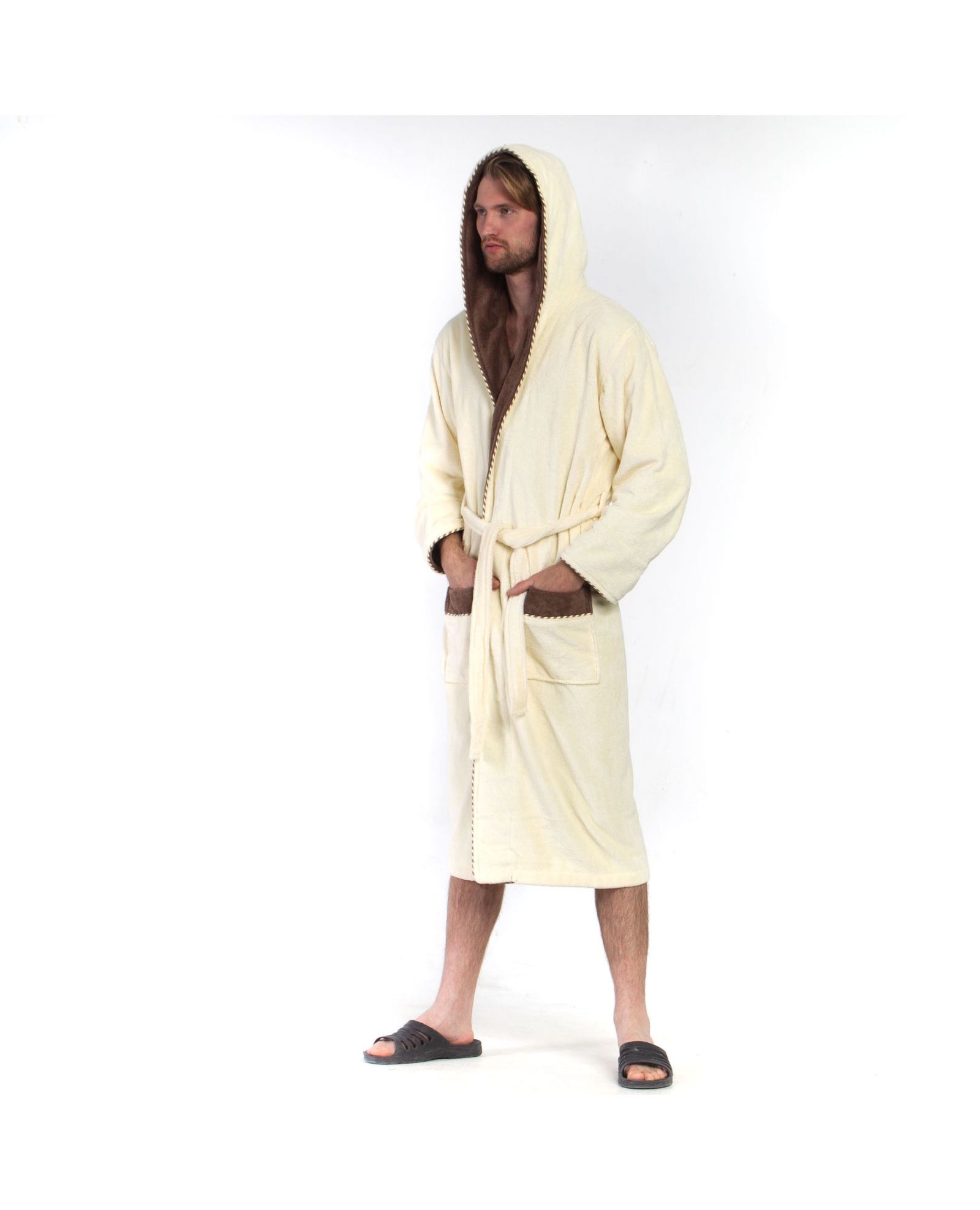 Мужской махровый халат на запах с капюшоном белый