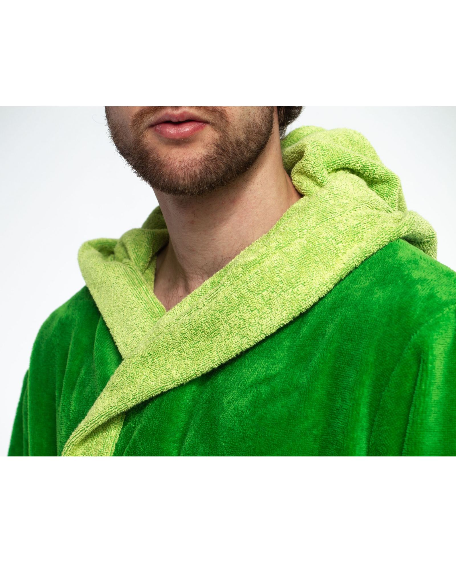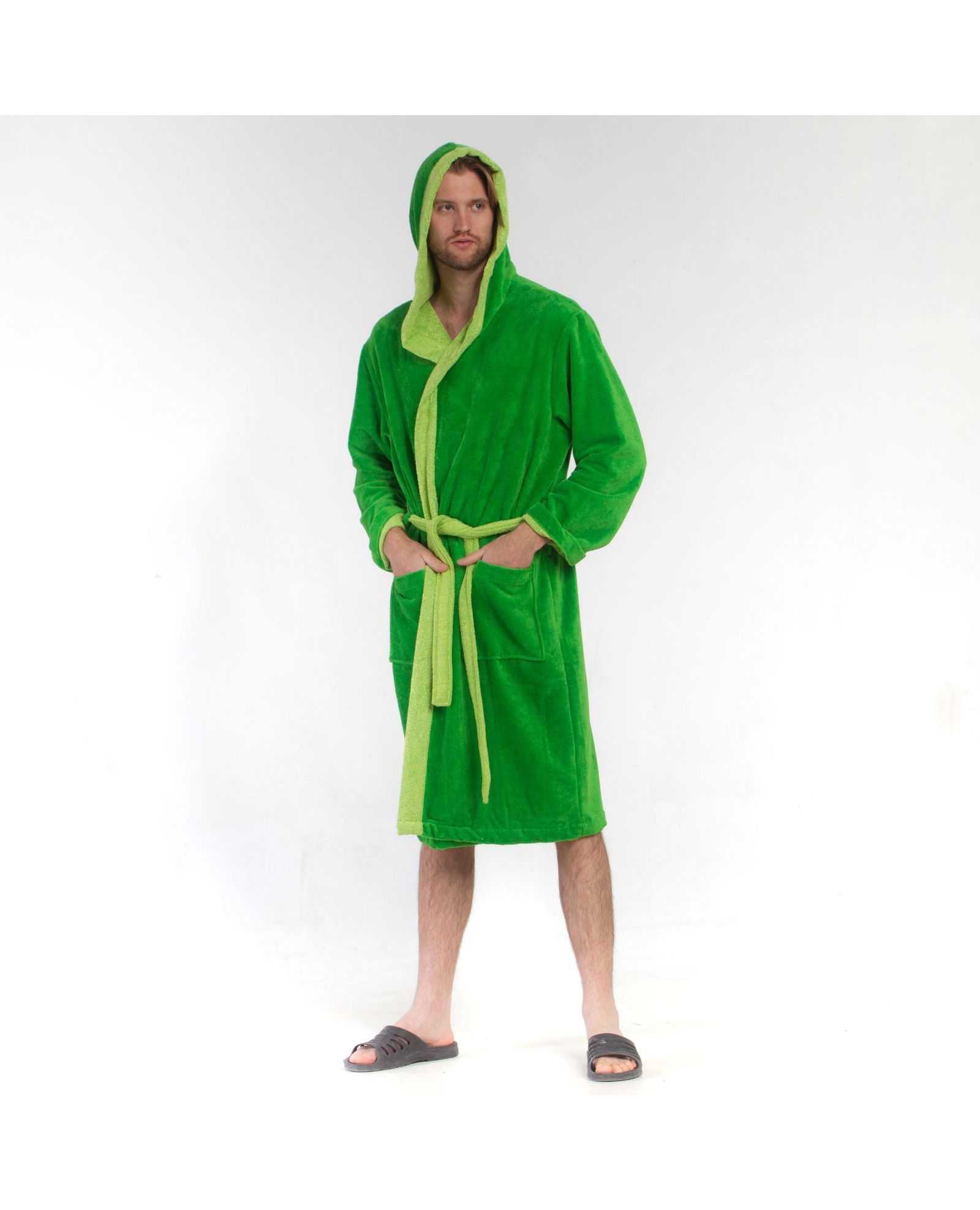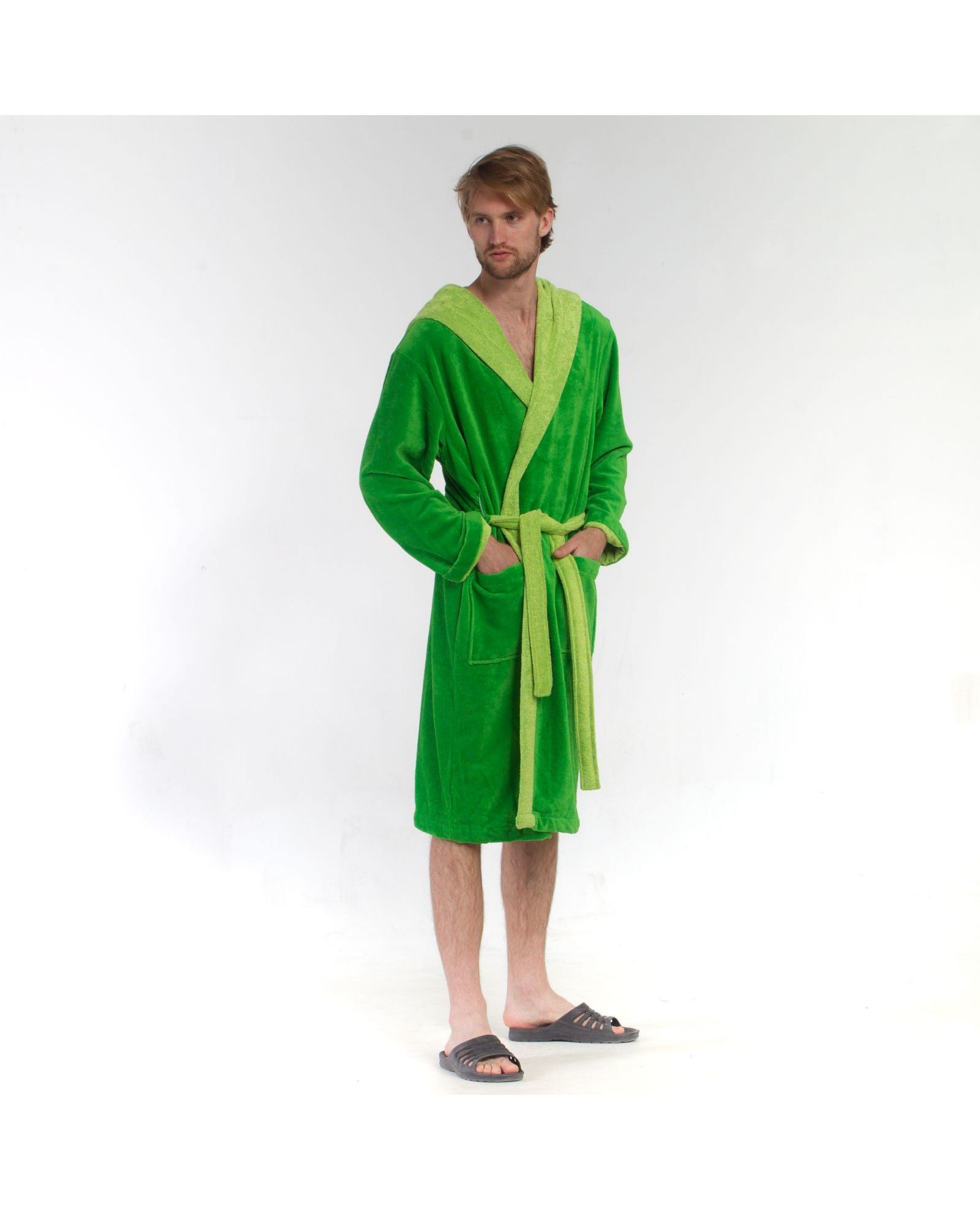 Мужской махровый халат на запах с капюшоном — практичный и комфортный вариант для дома, после душа или отдыха. Махровая ткань с сочетанием хлопка, бамбука и полиэстера хорошо впитывает влагу, быстро сохнет, приятна к телу и отличается износостойкостью. Свежий салатовый цвет придаёт изделию яркий и современный вид.