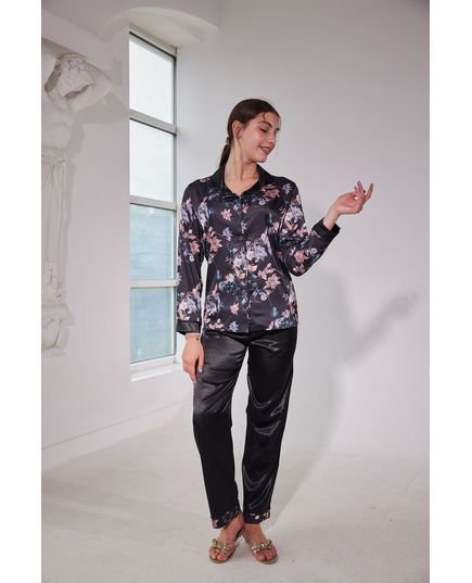 Домашний костюм рубашка+штаны. Рубашка на пуговицах с цветочным принтом. Штаны черного цвета на резинке.