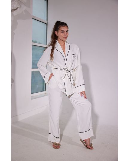 Короткий халат+штаны. Халат с широким поясом. длинные рукава, на запах, один карман с вышивкой . Штаны на резинке, 2 кармана. Цвет молочный с черной окантовкай по краям.
