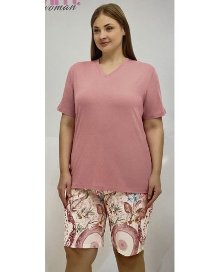 Футболка+ удлиненные шорты. Футболка однотонная пудрового цвета, V-образный вырез. Шорты удлиненные с цветочным принтом