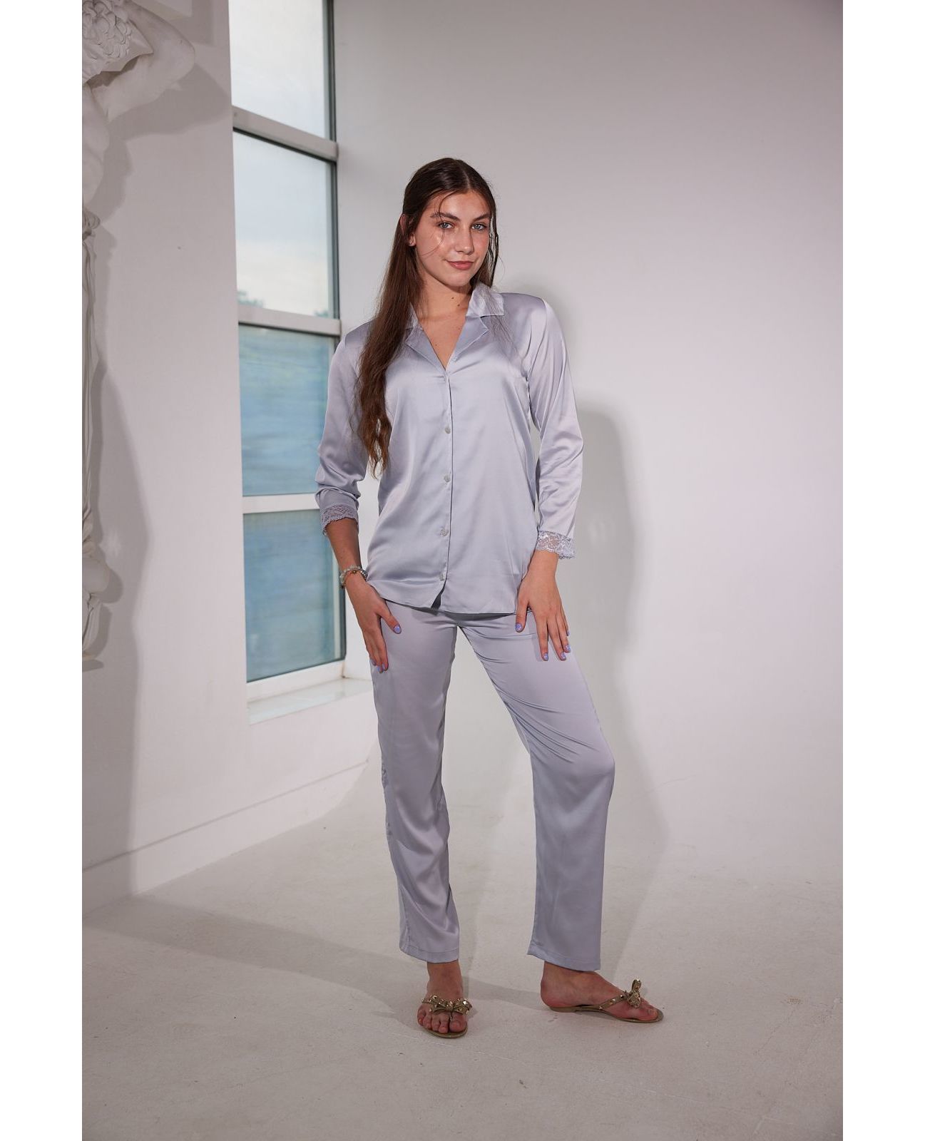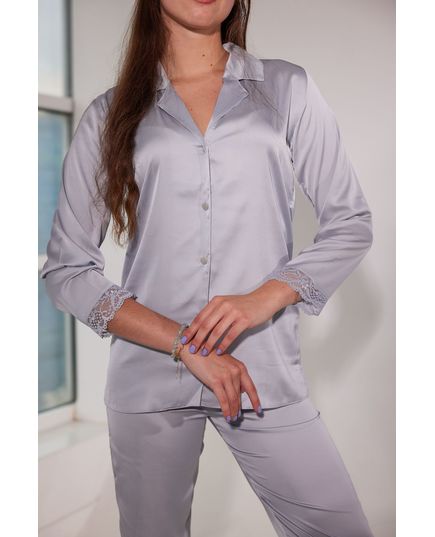 Домашний костюм рубашка+штаны. Рубашка на пуговицах, рукав длинный, кружевная отделка рукавов. Штаны на резинке.