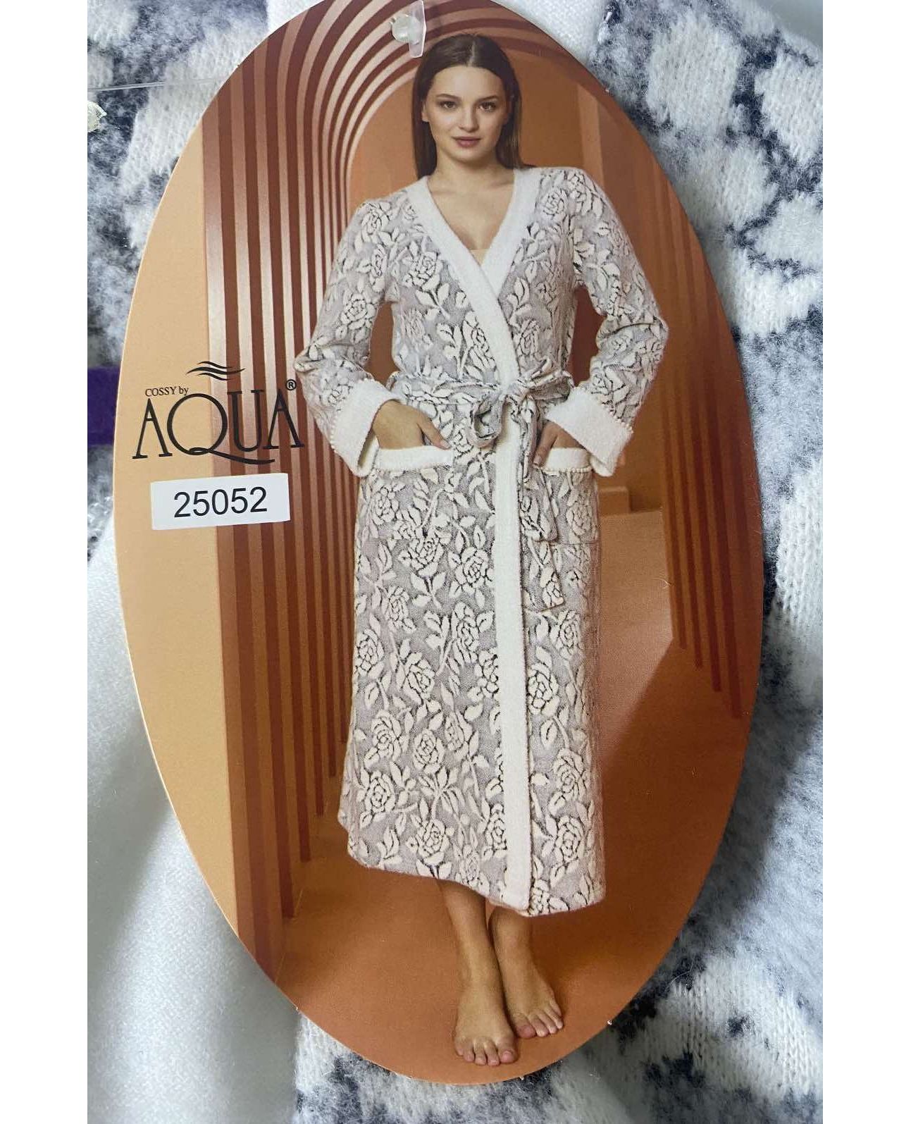 Элегантный женский халат на запах серого цвета с белым цветочным принтом. Модель украшена декоративными бусинками, которые придают изделию изысканный и женственный вид. Удобный крой обеспечивает комфортную посадку и свободу движений, идеально подходит для дома и отдыха.