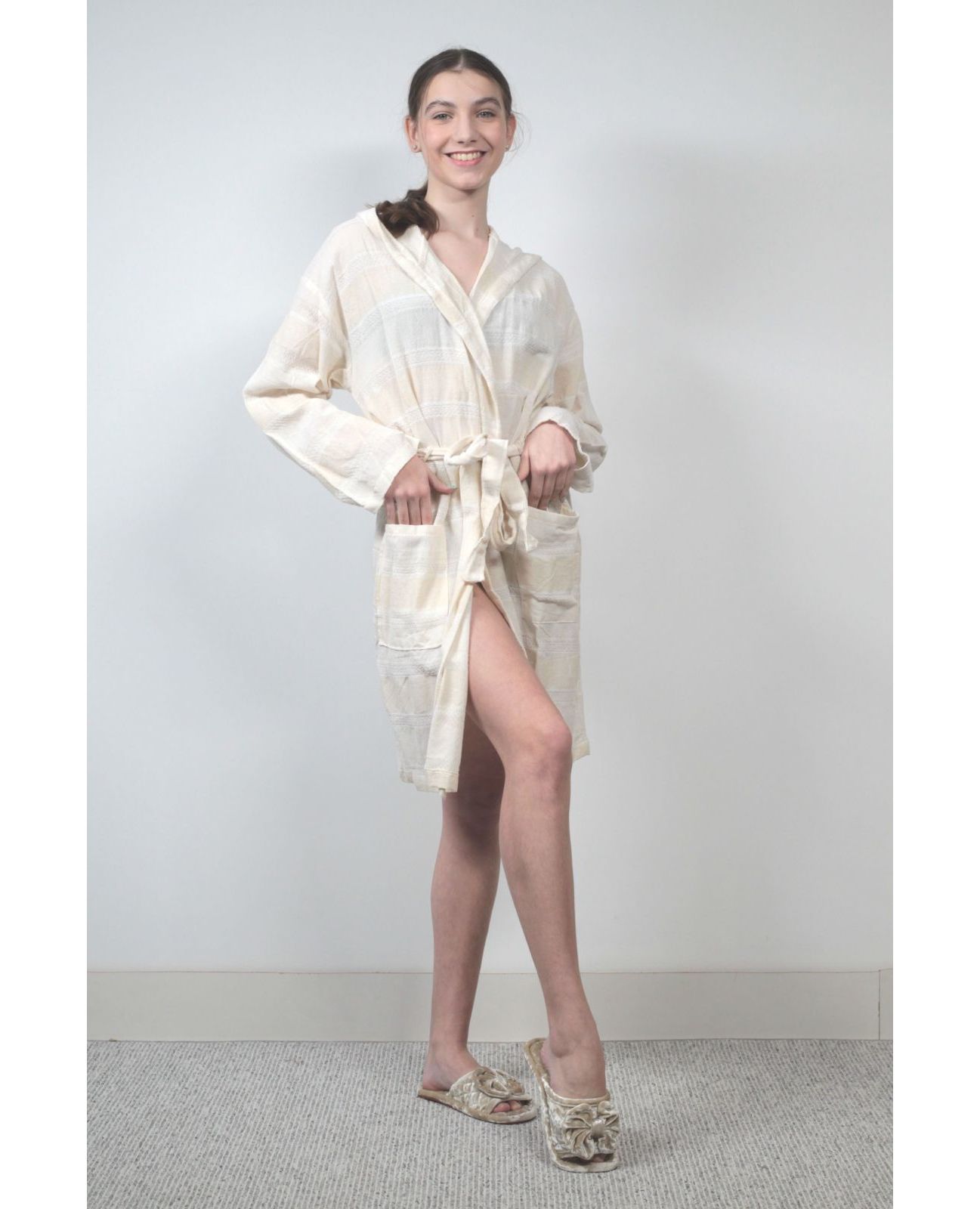 Халат изготовлен из 100% хлопка — натурального, мягкого и дышащего материала, который хорошо впитывает влагу и приятен к телу.