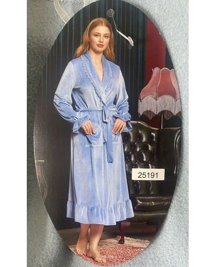 Изысканный женский велюровый халат на запах в нежном голубом цвете. Модель украшена элегантным кружевом, которое подчёркивает женственность и придаёт образу утончённость. Мягкая и приятная к телу ткань обеспечивает комфорт и уют при носке. Идеальный вариант для дома и отдыха.
