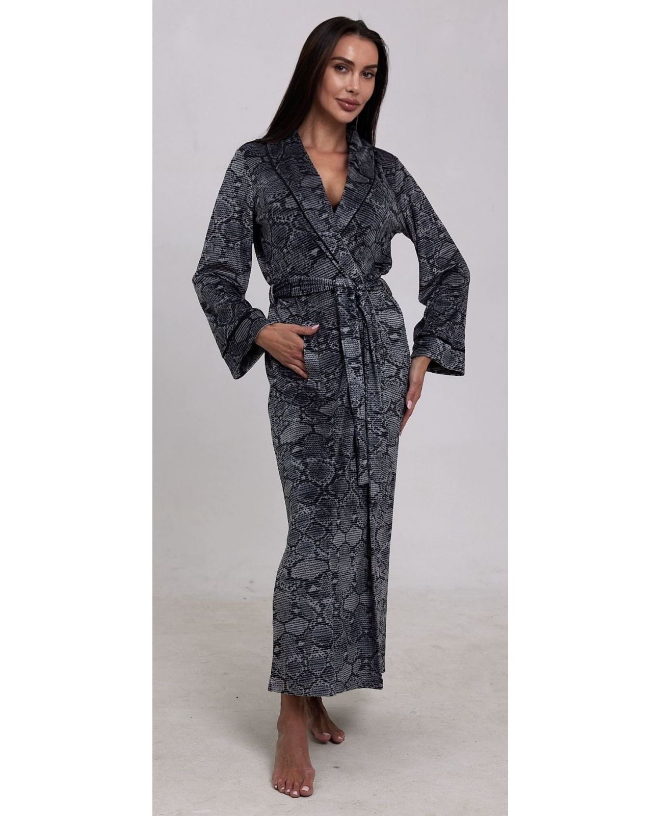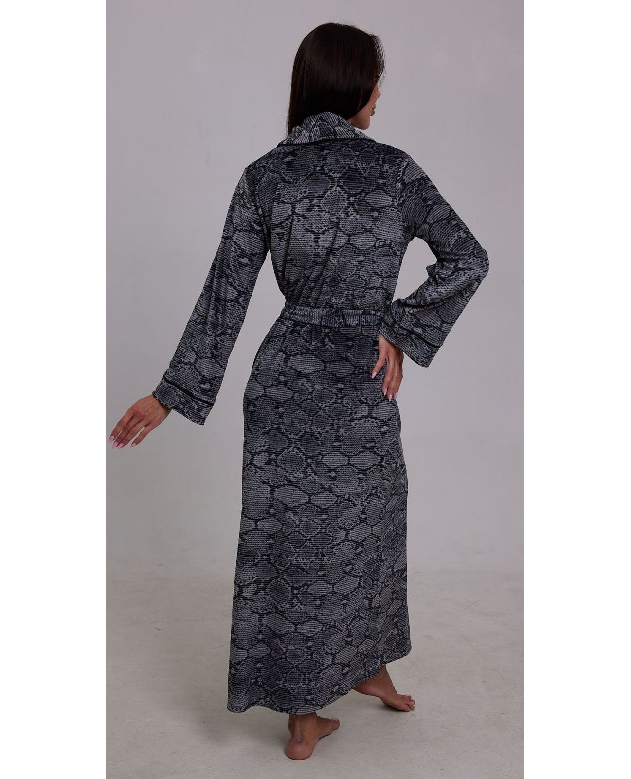Женский велюровый халат на запах серого цвета — практичный и элегантный вариант для дома. Мягкий велюр приятен к телу, хорошо тянется и обеспечивает комфорт в течение дня. Модель на запах подчёркивает фигуру и дарит свободу движений. Качественный материал и аккуратный пошив делают халат удобным для повседневной носки.