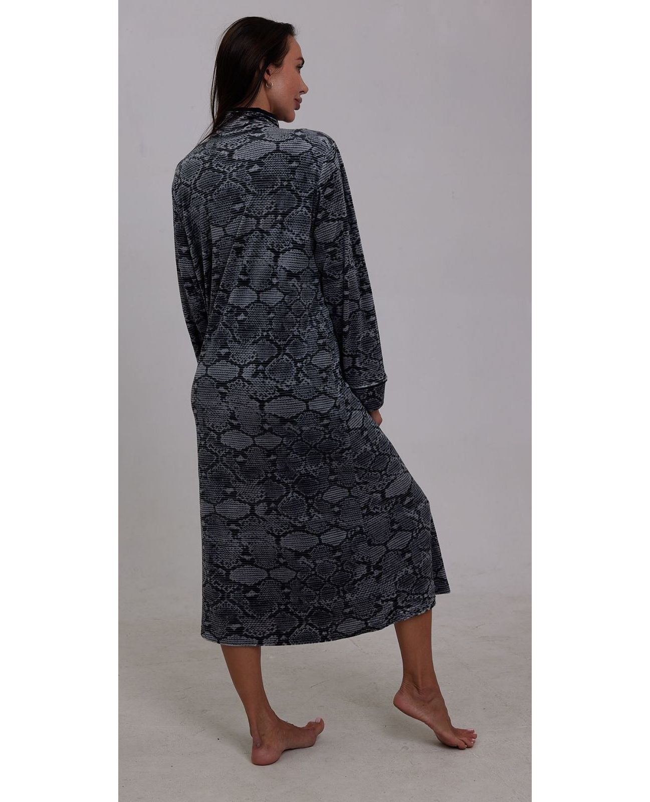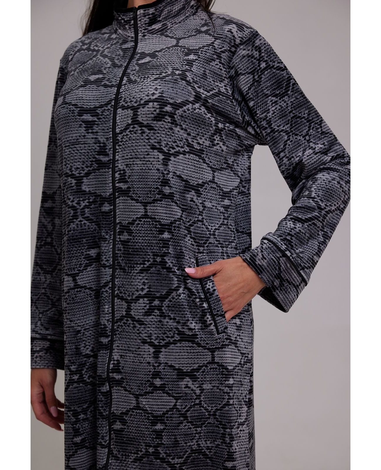 Женский велюровый халат на молнии серого цвета — практичный и комфортный вариант для дома. Мягкий велюр приятен к телу, хорошо сохраняет форму и обеспечивает удобство при носке. Застёжка-молния делает халат удобным и функциональным для повседневного использования.